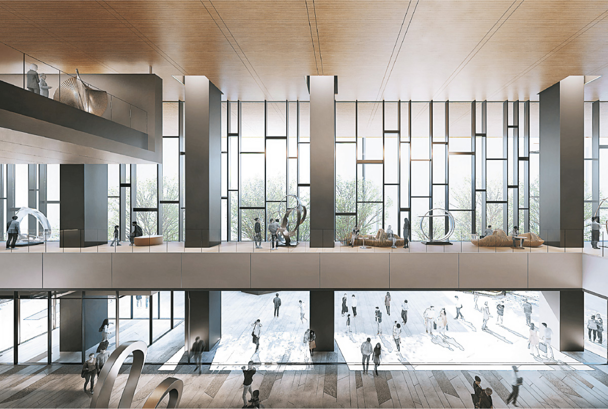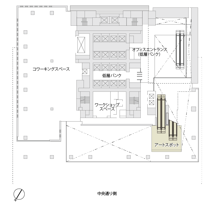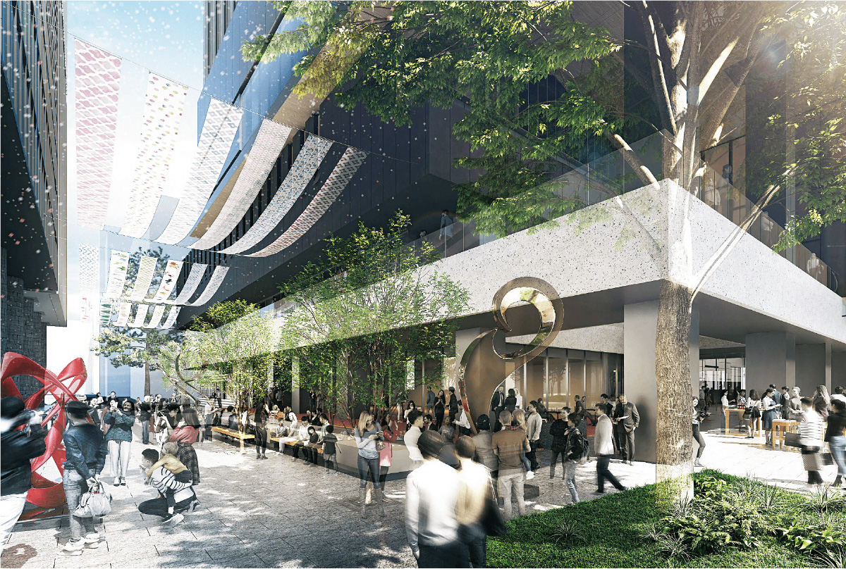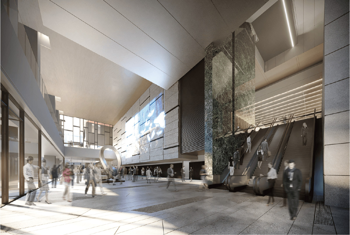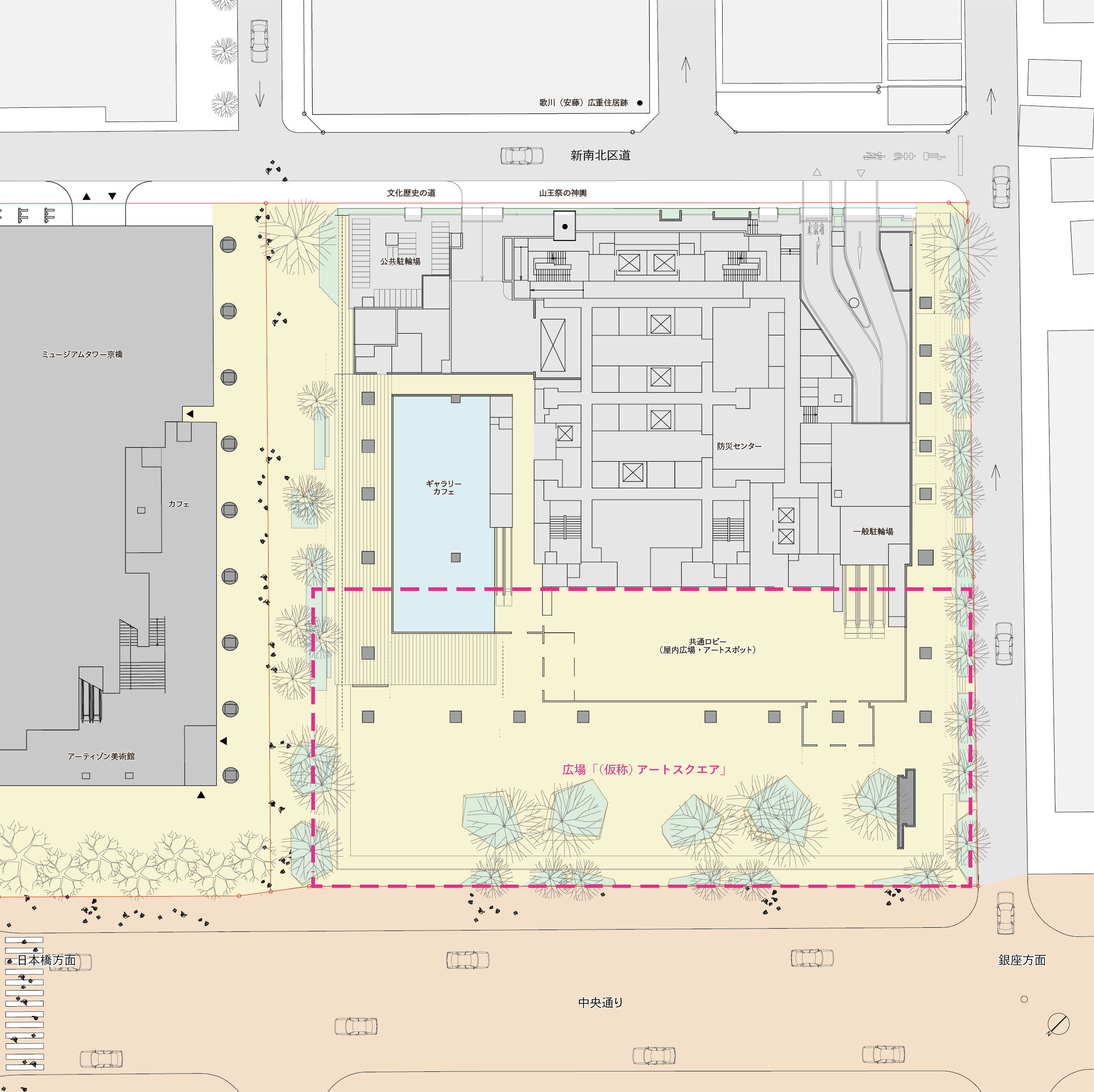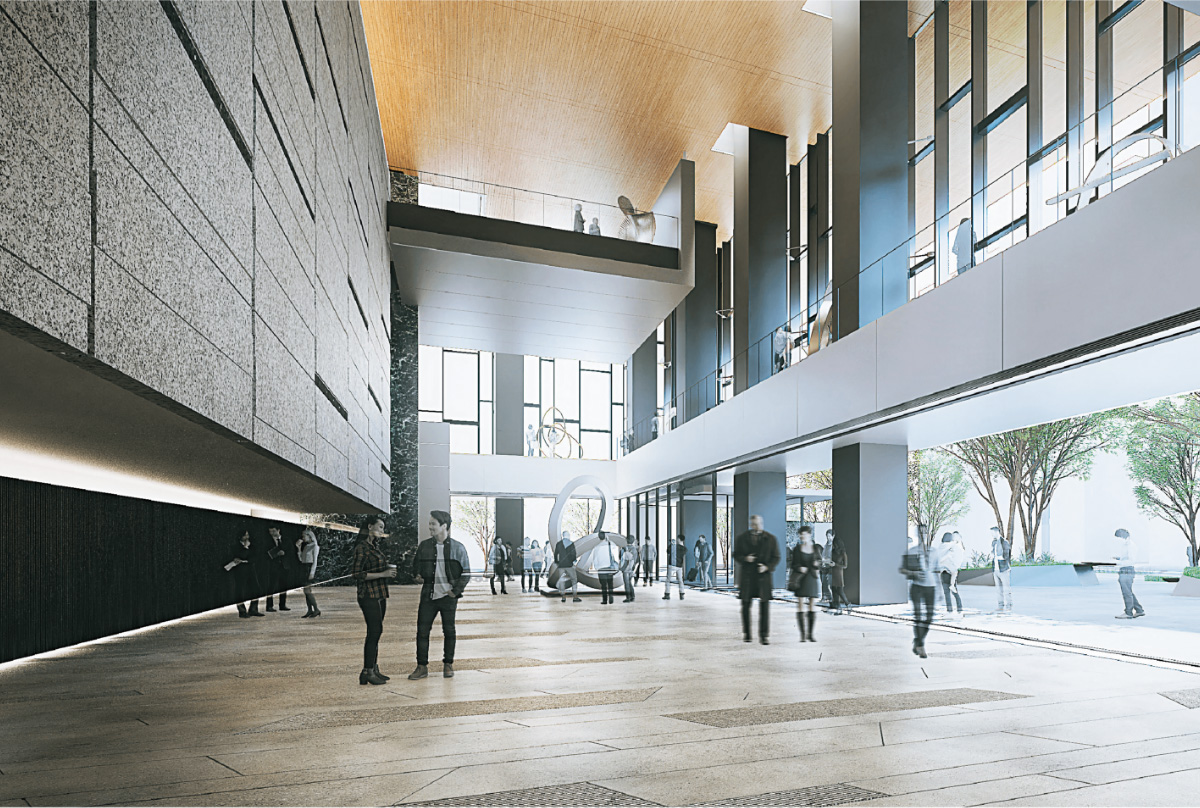 中央通りからシームレスに連続する広場「(仮称)アートスクエア」を通過し、3 層に吹き抜けた共通ロビーに通じます。その空間には2 階