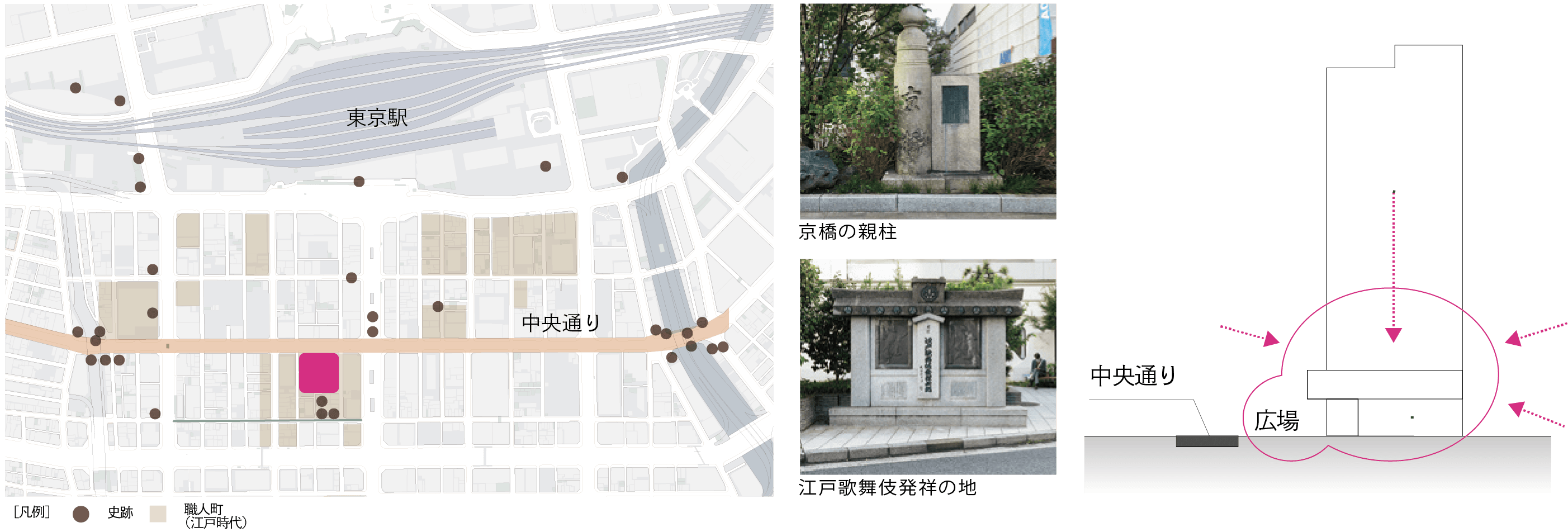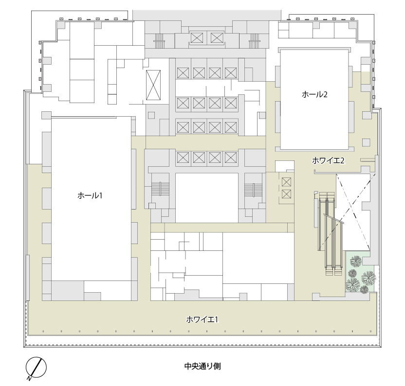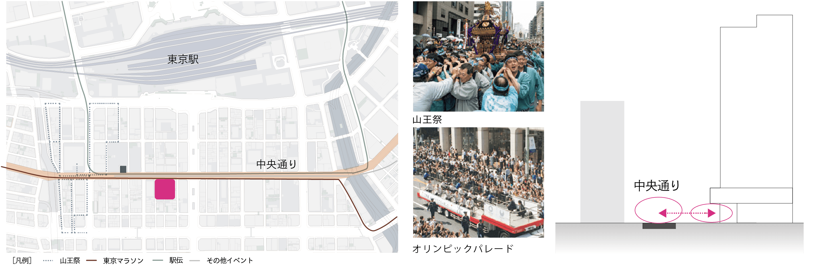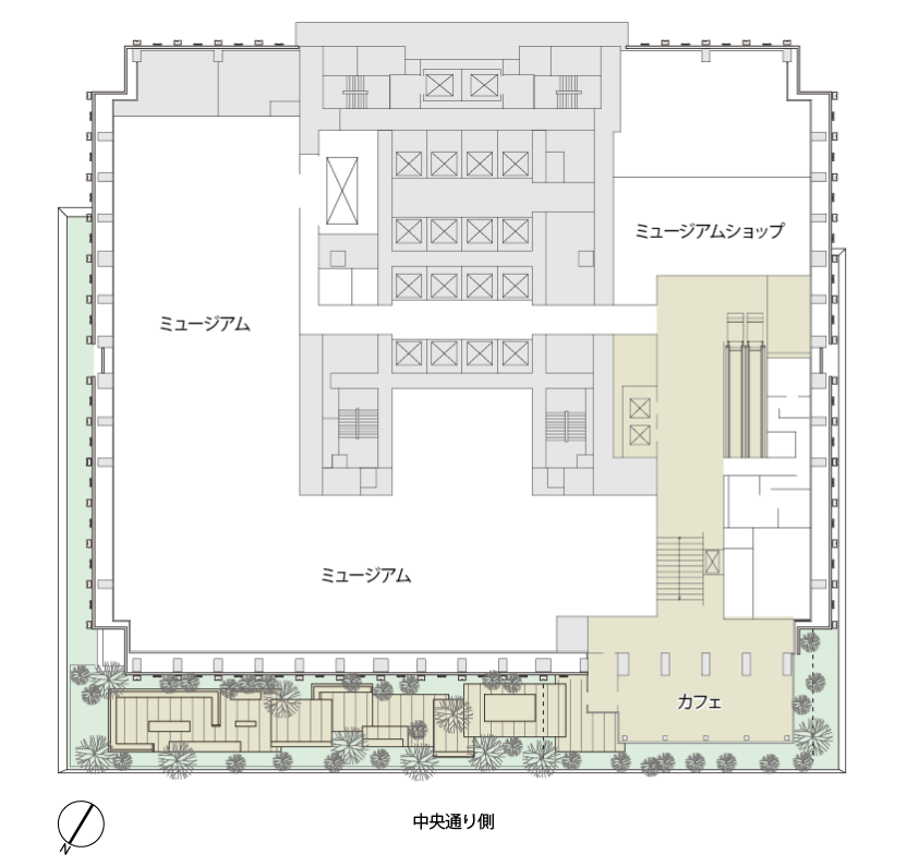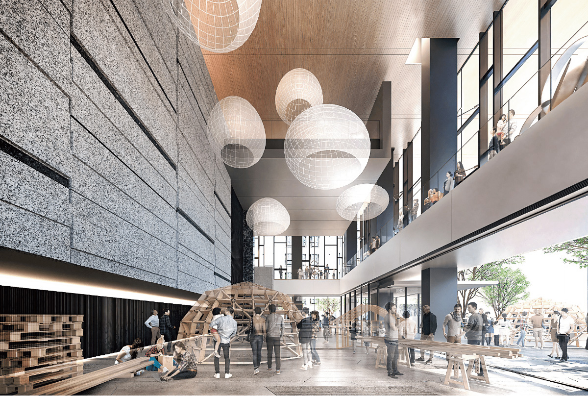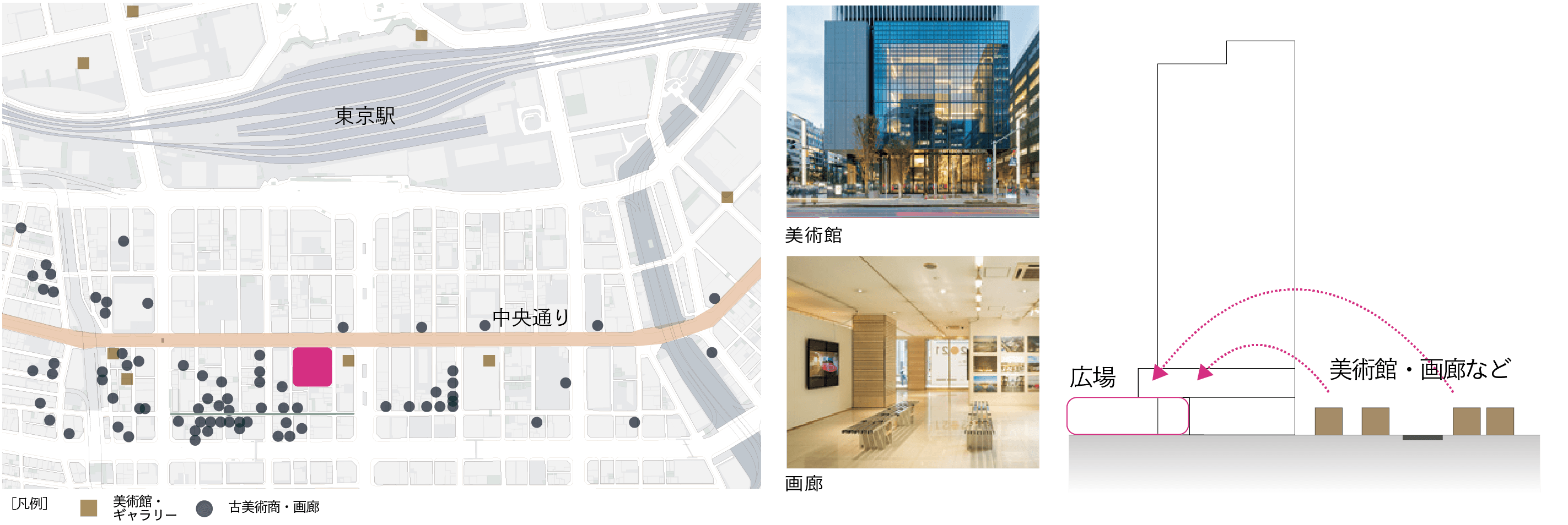 中央通りからシームレスに連続する広場「(仮称)アートスクエア」を通過し、3 層に吹き抜けた共通ロビーに通じます。その空間には2 階