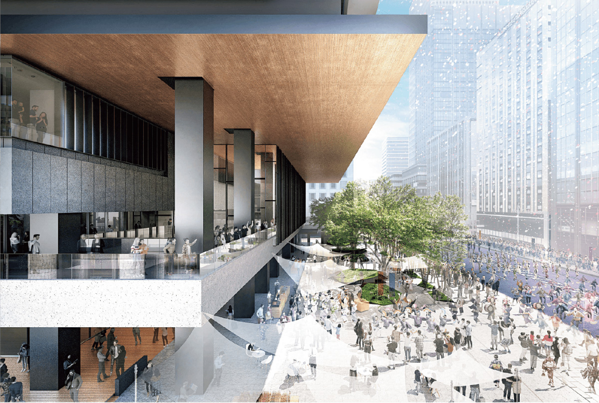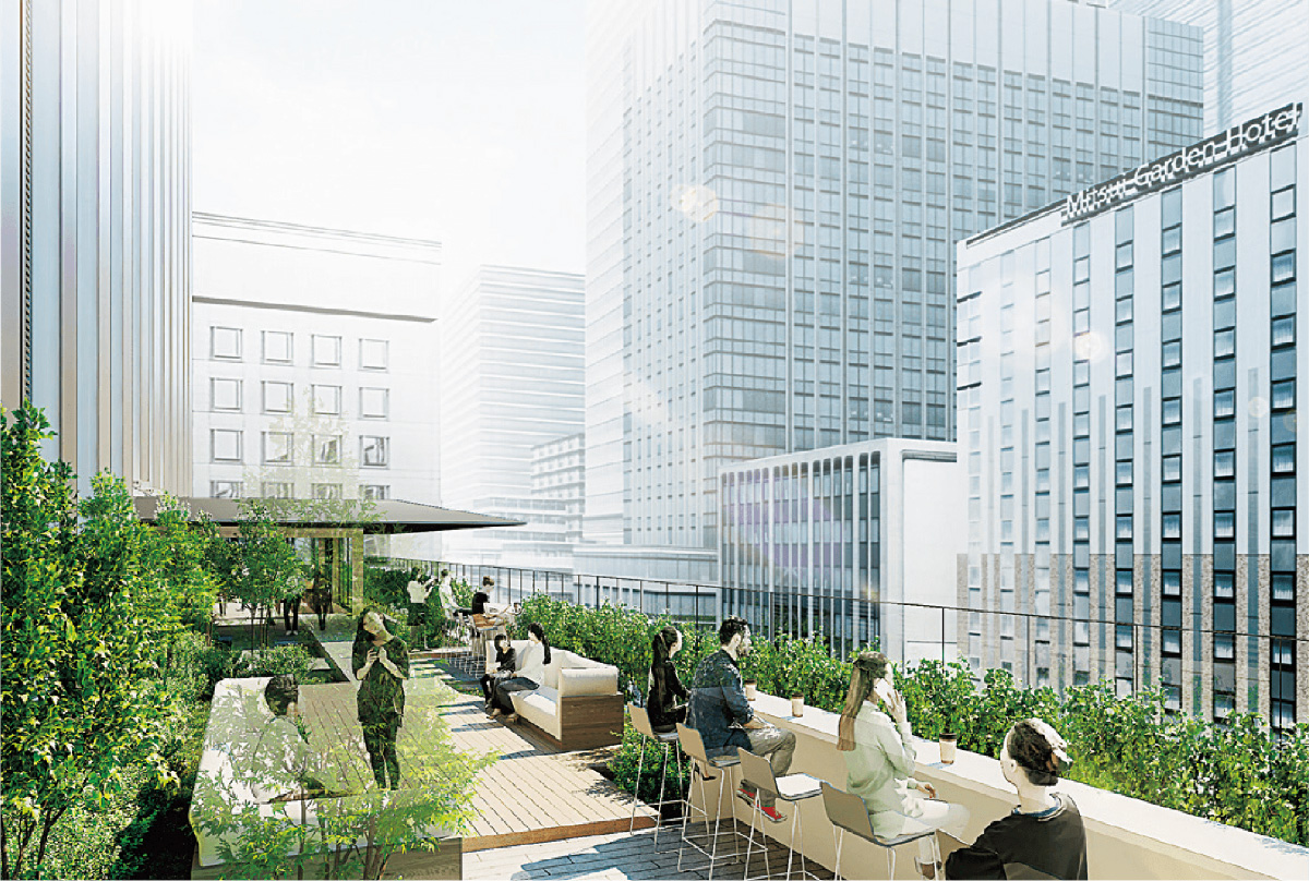 吹き抜けによって縦方向の視線をもたらし、2階から上のアクティビティが感じられる空間構成としています。ワーカーのABW の場ともなる非日常的な空間が、刺激し合い新しい価値を生み出す革新的な場となります。各階を繋ぐエスカレーター、回廊、テラスへ自由に回遊でき、京橋周辺の特色である路地空間の立体的な繋ぎ合わせに見立て名付けられた「立体的路地空間」が「繋ぐ・繋がる場」となります。