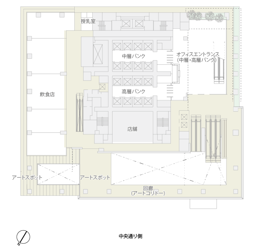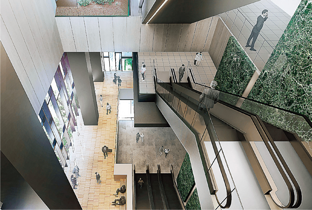 のアートコリドー、3 階のアートスポットが望め、立体的にアートを集積しています。人々はエスカレーターを上り、それぞれの目的地へ、それぞれの営みを感じながら向かっていくことができます。1階から上層への動線も最大限共有化し「繋ぐ・繋がる場」を可視化しています。