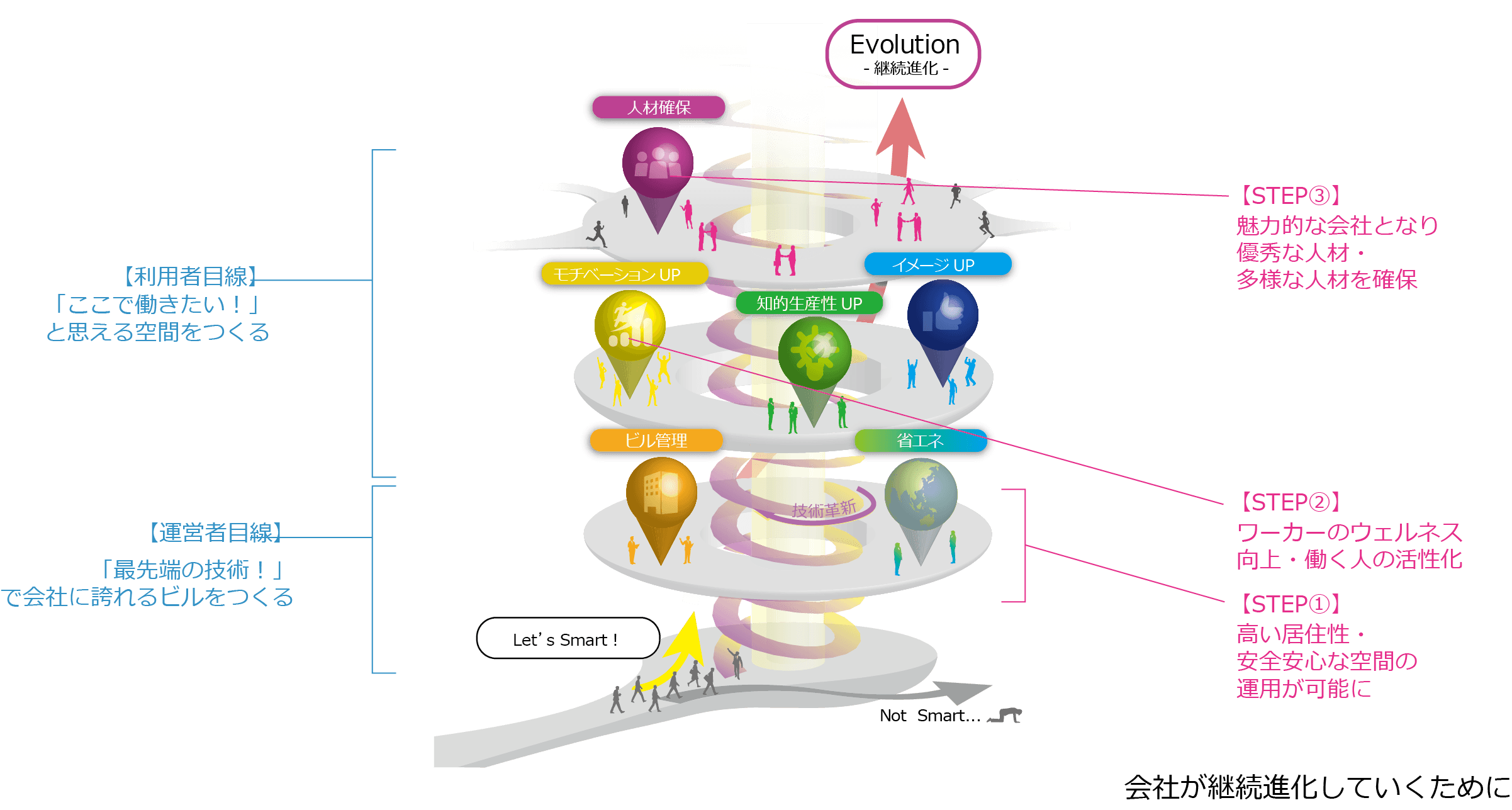 人の位置情報、環境情報、外部情報、他さまざまなデータを「ビルOS」に呼び込み統合型制御を行います。ヒューマンセンシング(人の位置情報)を中心に各種技術の連携を図り、人に優しく、機能的で環境に配慮した次世代型の統合ビル制御などのスマート技術の採用により、これからのオフィスに求められる「高い居住性と安心安全の確保」「生産性、ウエルネスの向上」「高い省エネ性とビル管理の自動化」を実現します。