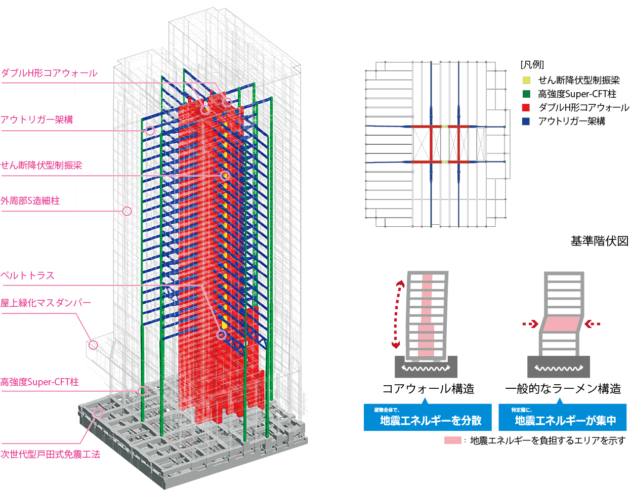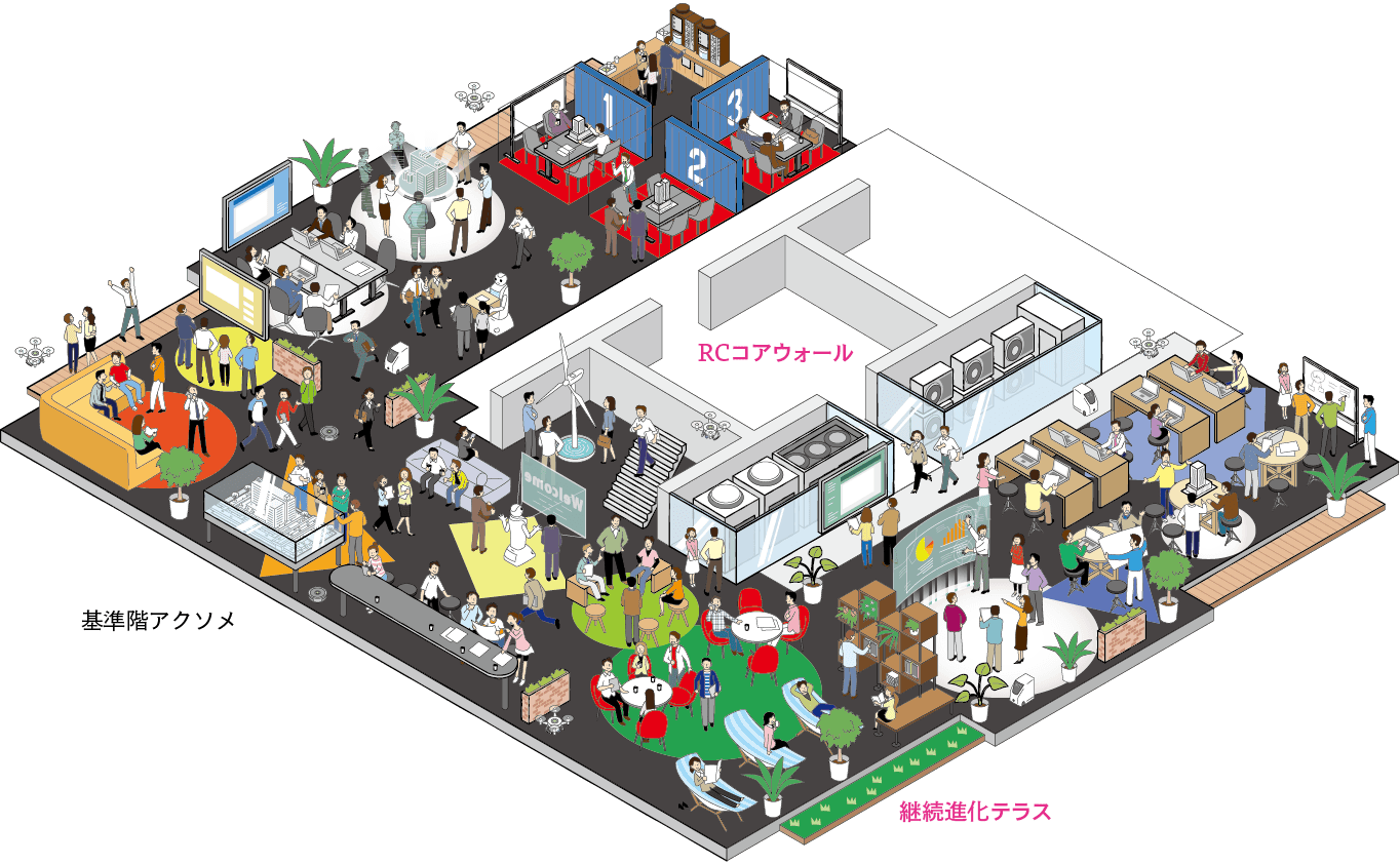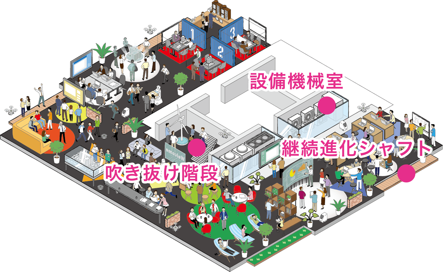 私たちは価値創造の空間を生み出し将来の働き方、世の中のさらなる変化が起きても更新できるように、実験、評価、創発を循環し続けることができるワークプレイスを目指します。低層部のコラボレーションスペースや外部との創造的活動と連携し、働くこと自体が価値創発となる場をつくり、そこで見出された新たな技術を体感・実証できる実験の場、データを収集し効果を得る評価の場の実現こそが重要だと考えます。