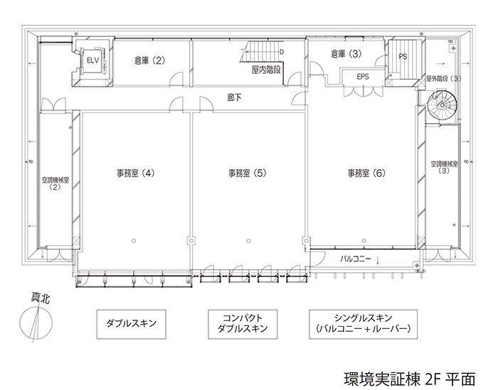 新TODAビルへ導入するシステムや ZEB化対応技術等の検証を行うため、環境実証棟を建設し実験を行いました。 実証実験では、南面の外装仕様をダブルスキン、コンパクトダブルスキン、バルコニー + ルーバーの3種類を実装し、室内に対する熱負荷の軽減等への効果を比較検証を行いました。