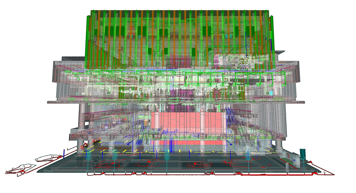 新TODAビルの計画では設計当初からBIMによって諸室の配置検討やガラリの設置位置、デザインへの影響等の詳細検証を行うことで、搬送経路の最適化を図りました。