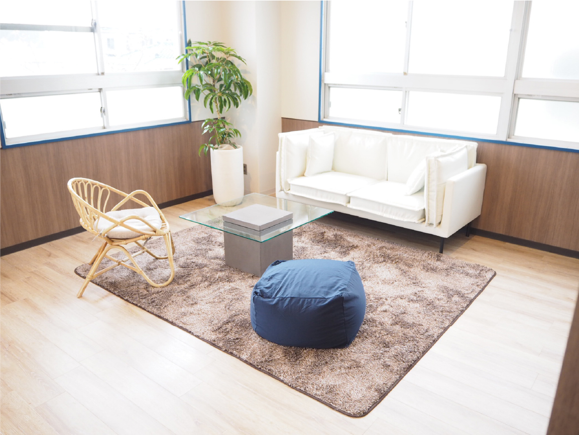 ワーケーションとは、仕事(work)と休暇(vacation)を組み合わせた造語です。会社のオフィスとは異なる「非日常」の環境の中で仕事をすることにより、集中力や生産性の向上、チームビルディングにも有効であるとされています。今回の計画では、普段のオフィスでは見られない仲間の一面を見つけるきっかけとしてほしいと思い、ソファやリラックスチェア、ラグなどを設けることで、リラックスしながら仕事ができる場をつくりました。