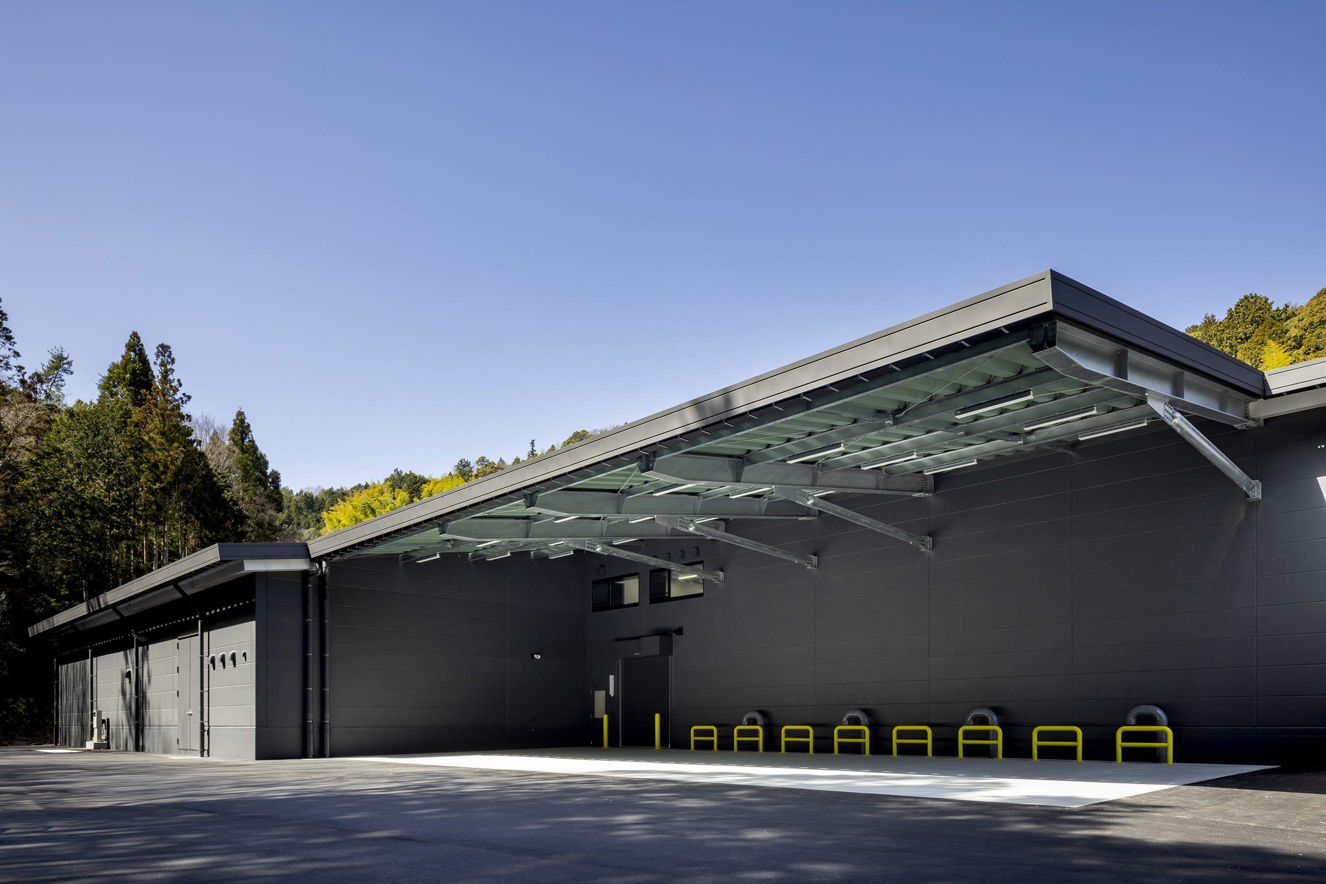 トラックヤード部分では、大型ウイング車から製品の搬出入をします。大庇は柱を落としたり、吊り構造としたりせず、切妻屋根と一体の片持ち庇とすることにこだわりました。梁せいを抑え、先端を絞ることで、搬入車両の軌跡や有効高さを確保しつつ、一体感のある外観とすることができました。