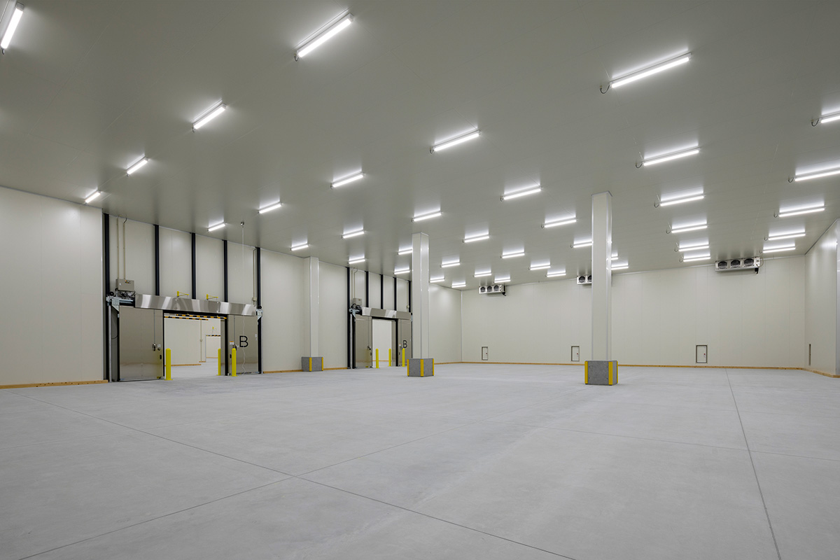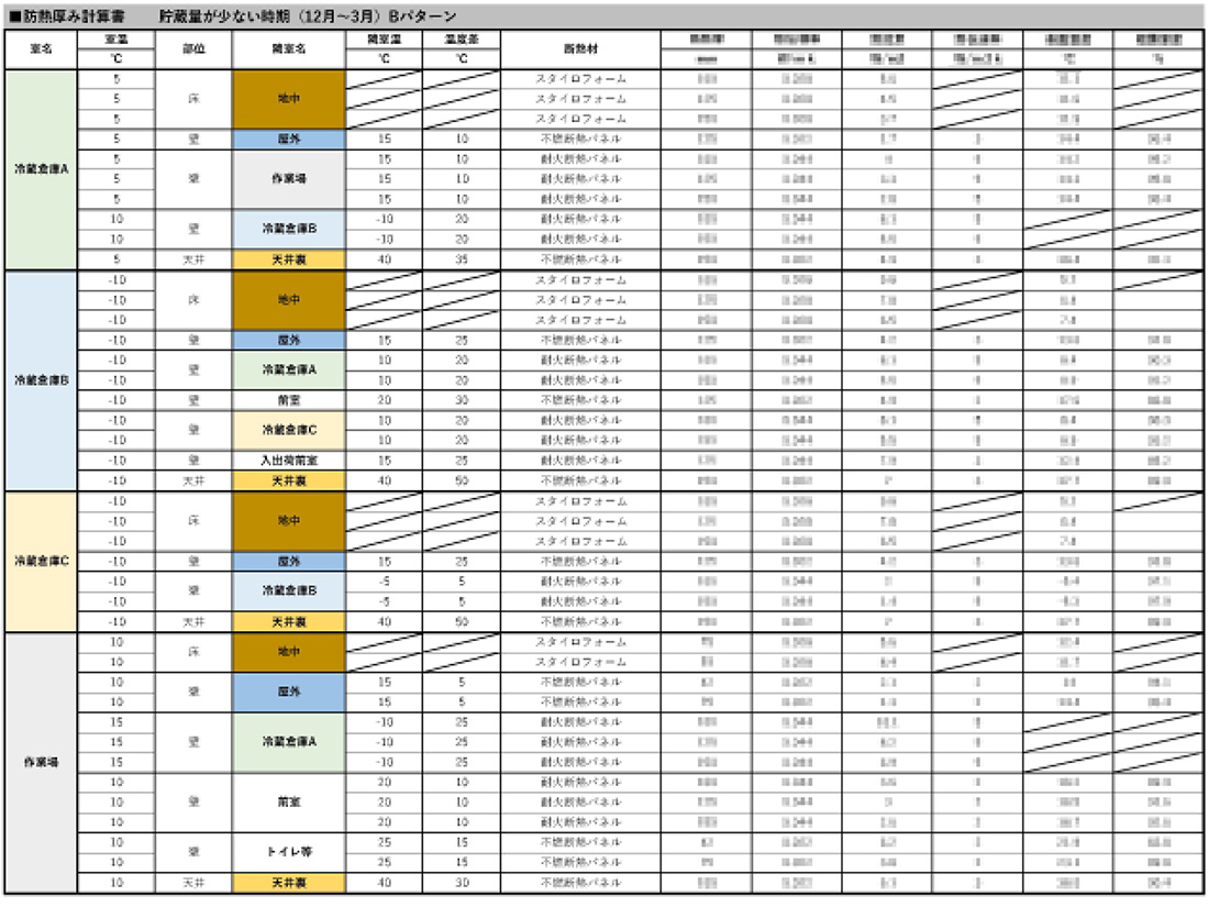 今回計画では季節毎に変化する庫内温度に柔軟に対応できるようにするため、各エリアの部位毎(天井・壁・床)に防熱計算をし、断熱厚さと結露対策を検証しました。検証の結果、結露リスクが高い部位については、断熱材を厚くしたり、除湿器を計画したりしました。