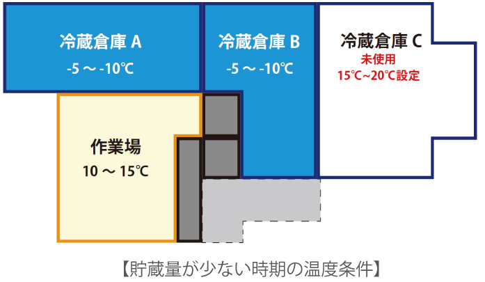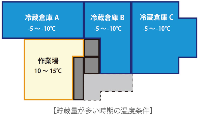 貯蔵量の増減に対応できるように、倉庫をA・B・Cの3つのエリアに分割できる計画としました。また、製品を貯蔵しないエリアについては、庫内温度を上げた運用を想定して防熱検討を実施しました。未使用エリアの空調負荷を低減することができたため、省エネに繋がったと考えています。