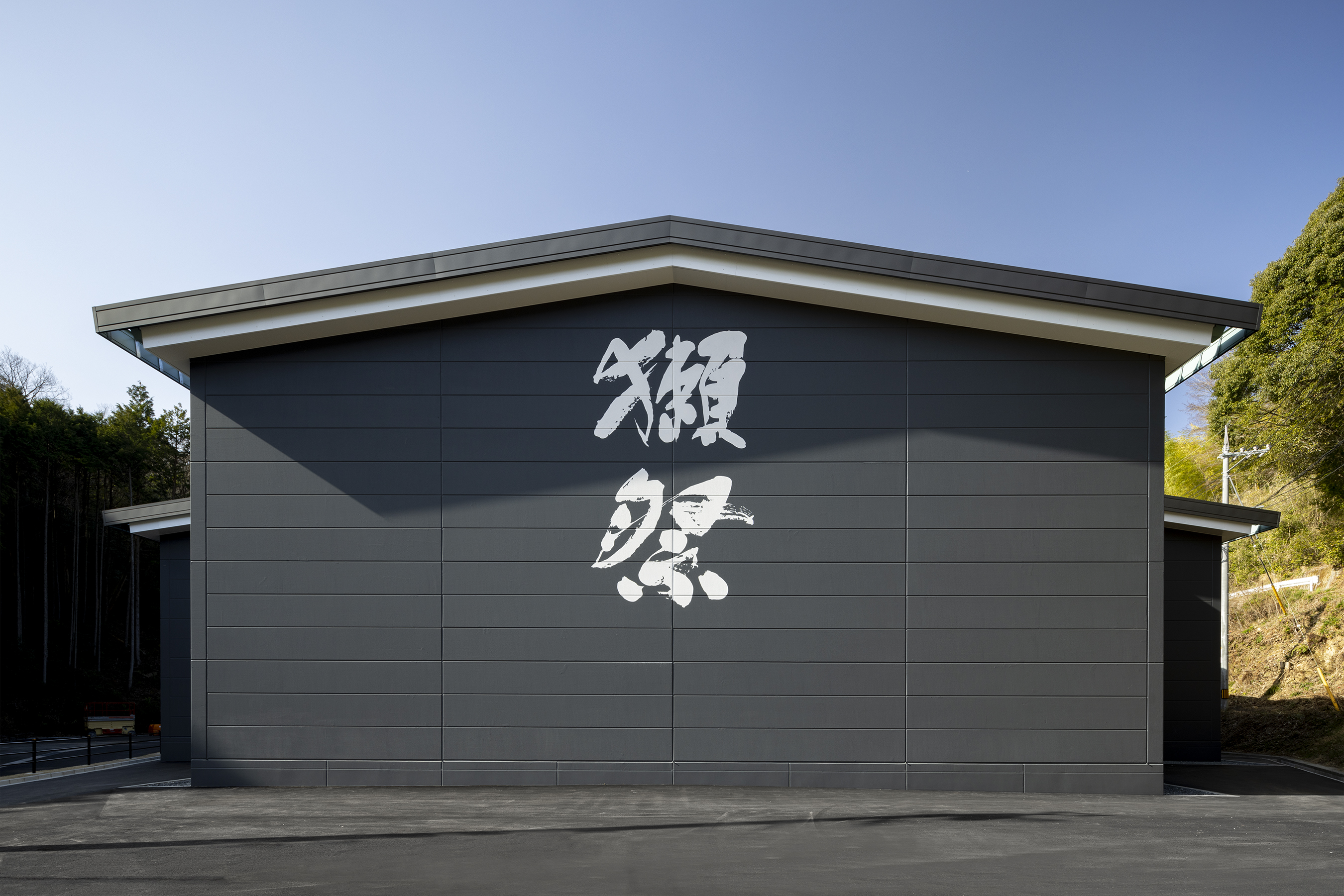 外観は緑豊かな周囲と調和しつつ、伝統的な酒蔵を踏襲した切妻屋根が印象的なデザインとしました。黒を基調とした外観色が周囲の緑との調和を高め、切妻屋根が周囲へのボリュームを抑えています。また雁行する屋根の周囲に鼻隠しを連続して回すことで、一体感のある印象を目指しました。