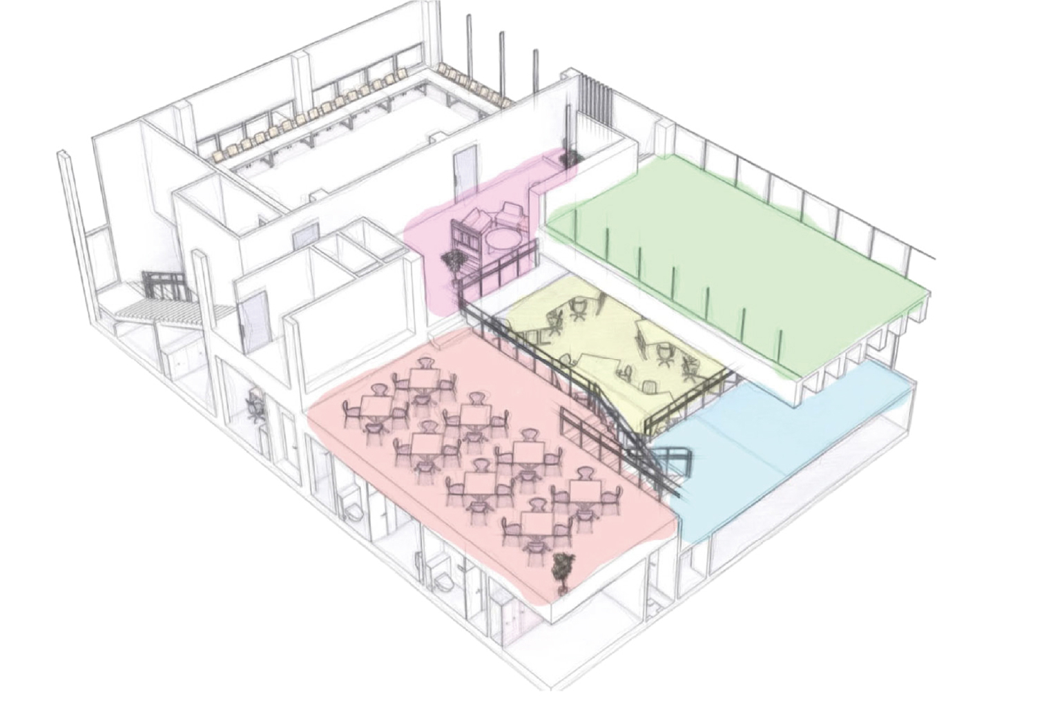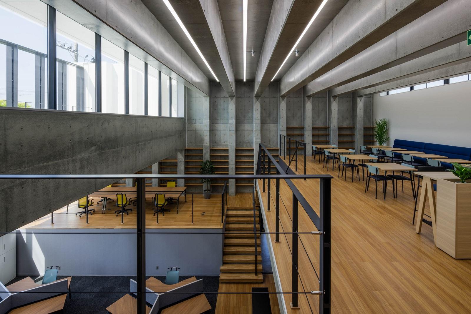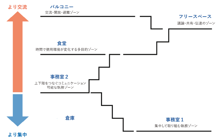 既存建物に面した北側2階の食堂や、避難用バルコニーは、壁で閉じたり階を分けてしまうと限られた時間しか使われないスペースになってしまうことから、それぞれを吹き抜けや開口で視線が通るようにし、それらをスキップフロアで緩やかに結びました。使用環境を限定しないことで、各プログラムを自然と足を運びやすく、その時の仕事内容やモチベーションに適した場所を、働き手が自ら選択します。