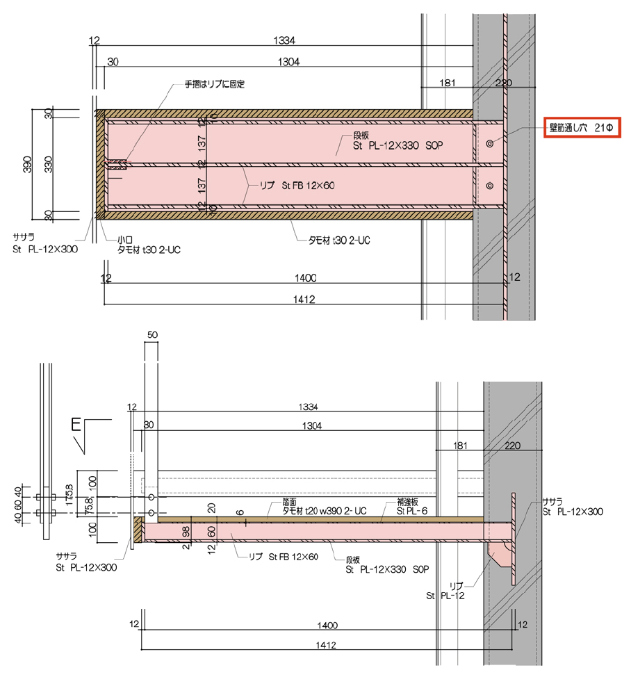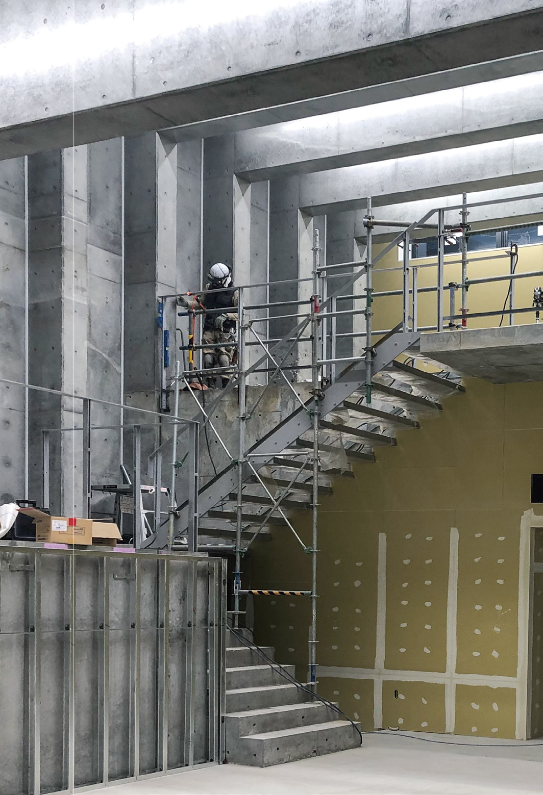 ボックス形状の各ゾーンをつなぐ階段は、それぞれの場を緩やかに柔らかく繋ぐために、そっと添えるように浮遊感のある設えとしました。片持ち階段を支持する側のササラを耐力壁内部に埋込とし、もう一方の側は施工中は仮設ササラを取付けて施工精度を確保して、タモ材の仕上の施工を行う直前で、コンクリートの硬化を確認したのち仮設ササラを取り外しました。