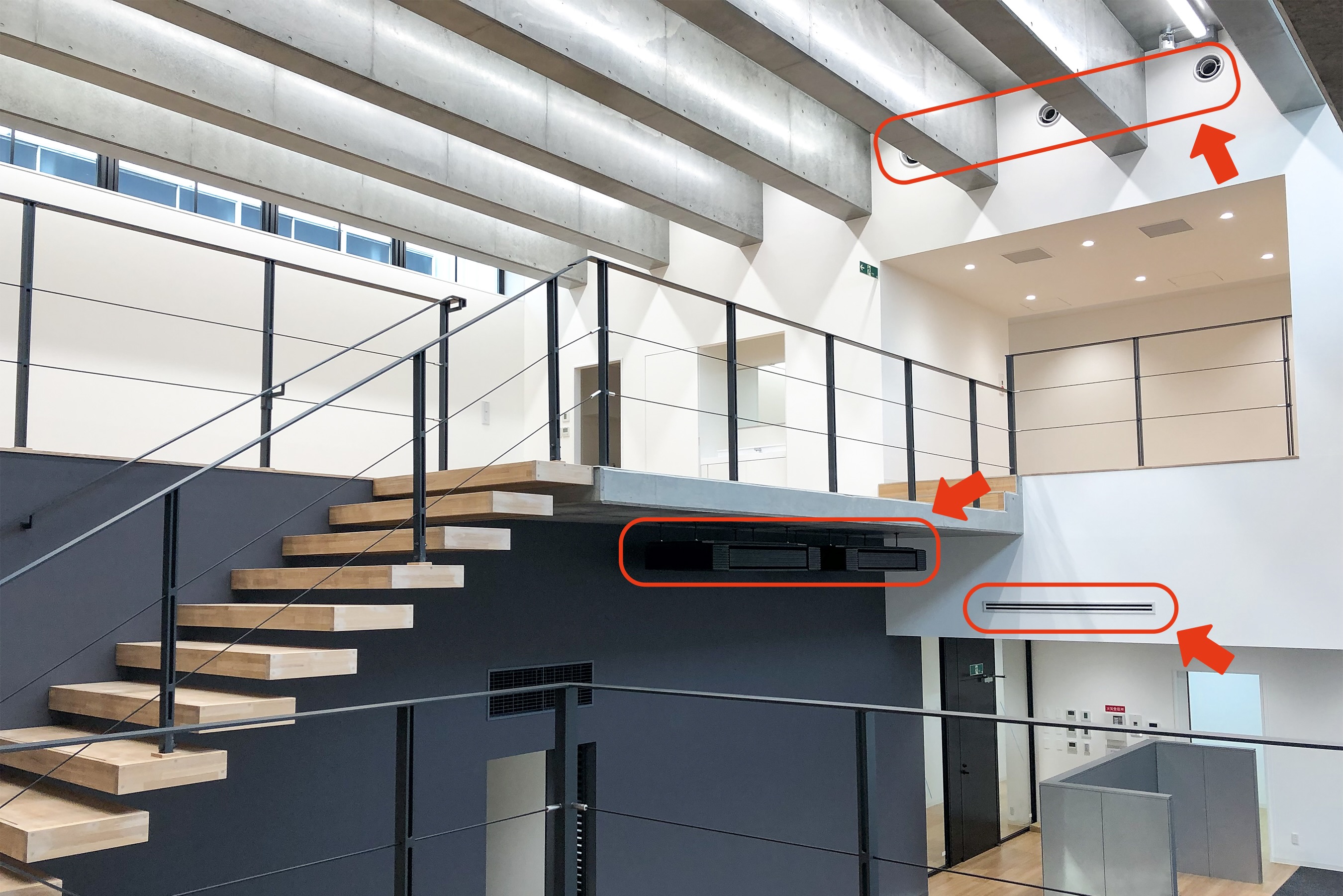 吹抜け空間でありながら快適な執務空間を実現するために、適切な空調・換気計画が不可欠です。空気環境の快適性に配慮しつつ直天井の意匠を損なわないよう壁吹き出しや、はね出しのスラブ下に吊り型の空調を採用するなど、小規模な面積のオフィスでありながら、設備計画においては意匠設計と細やかな連携を行いました。