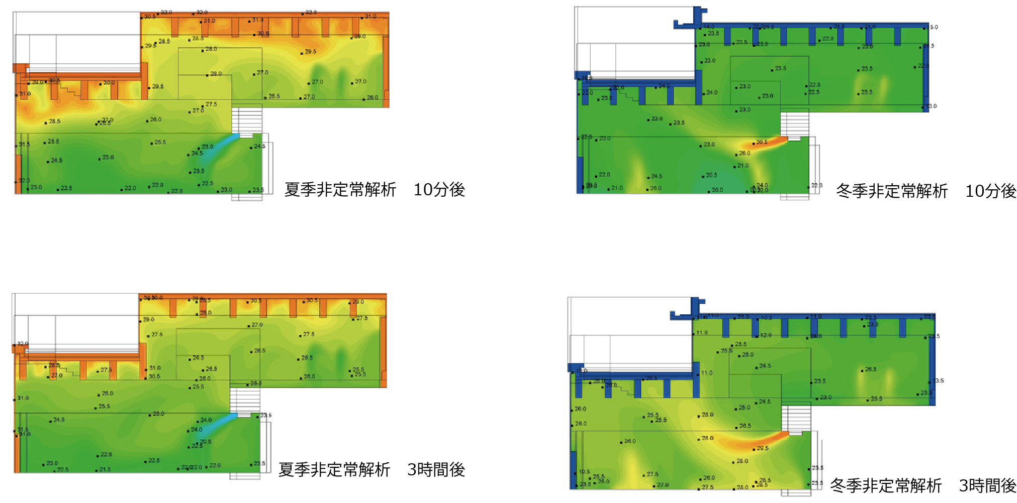 空調の効きムラが生じないように、任意に吹抜け断面を切り出して非定常解析を行いました。空調所要時間と温度分布を推定し、快適な温熱環境となることをシミュレーションによって確認しながら計画をしました。