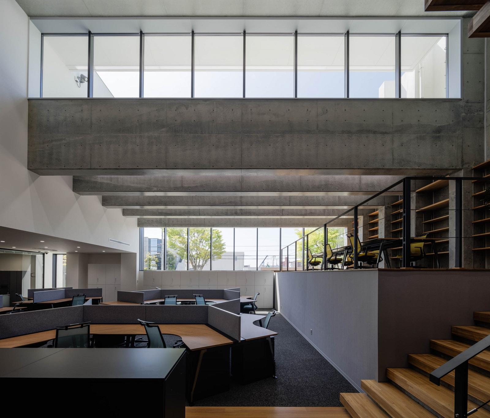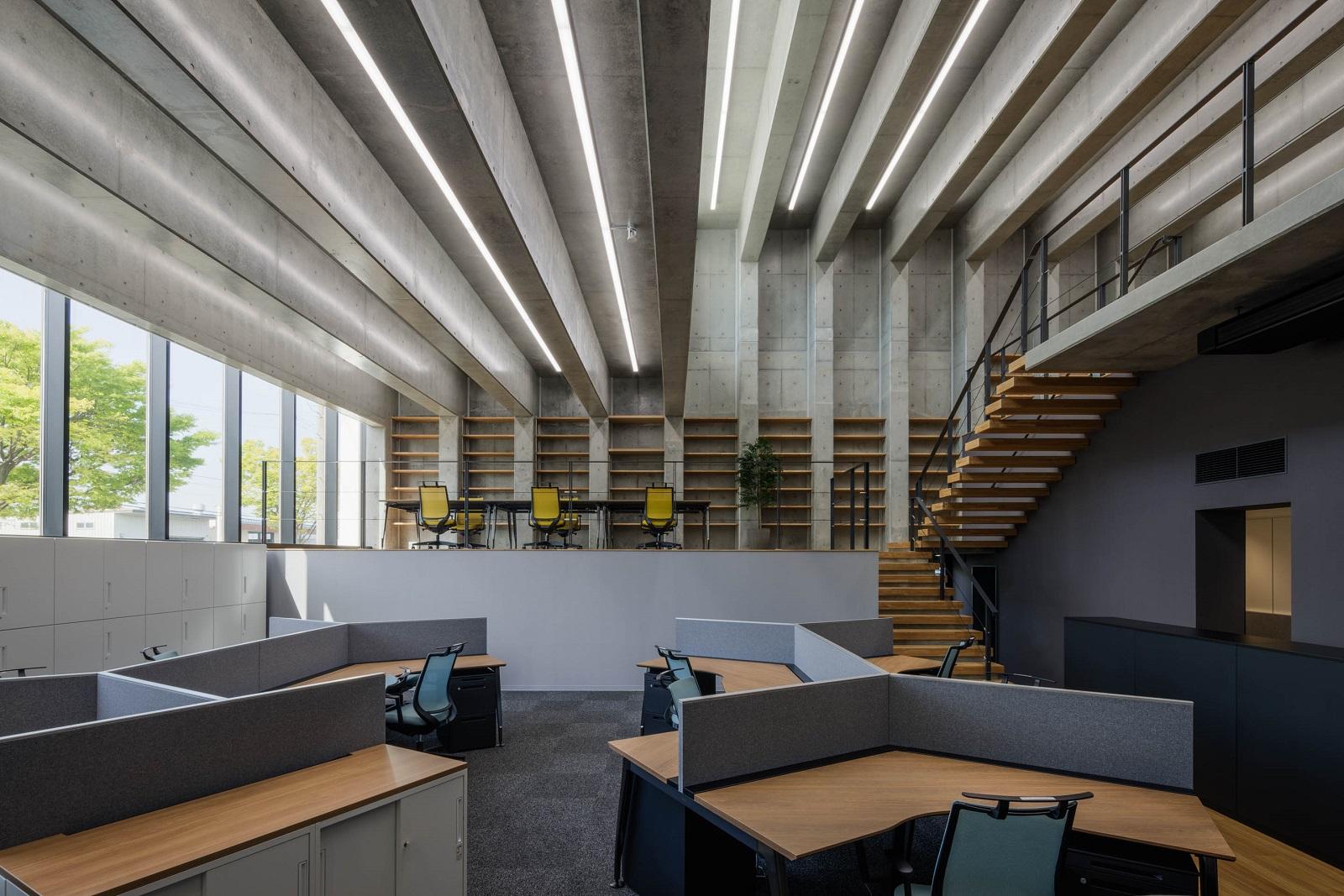 東北の震災復興に尽力してきた建設機械の土木工事会社の東北支店建替計画です。既存建物の東北支店が50年の節目を迎えたことから、建替えに当たっては、次なる50年に向けて気候変動や社会情勢など変化の大きい時代にも柔軟に対応できるような働き手の意識づくり、環境づくりを大切にしたいと考えました。