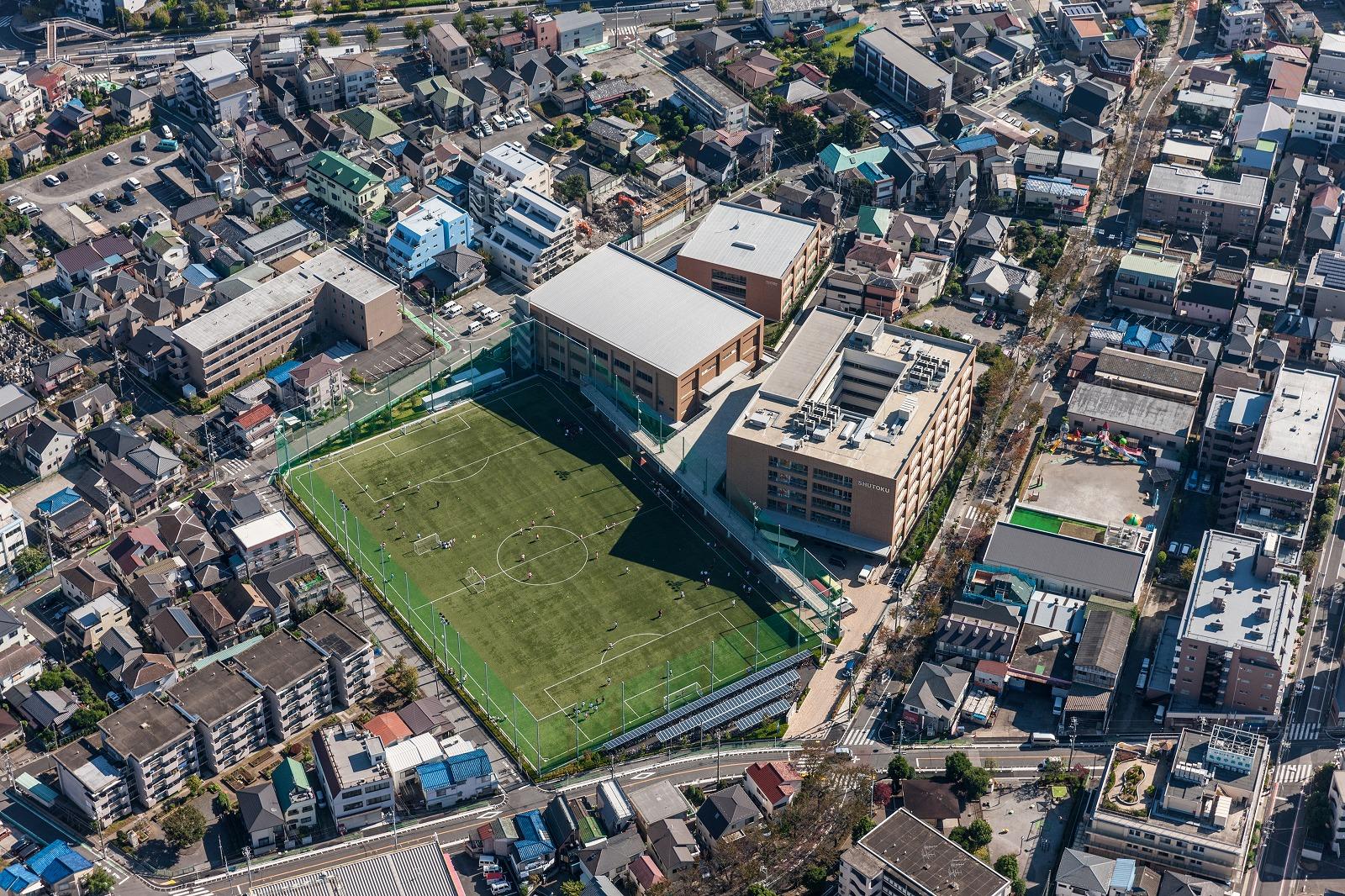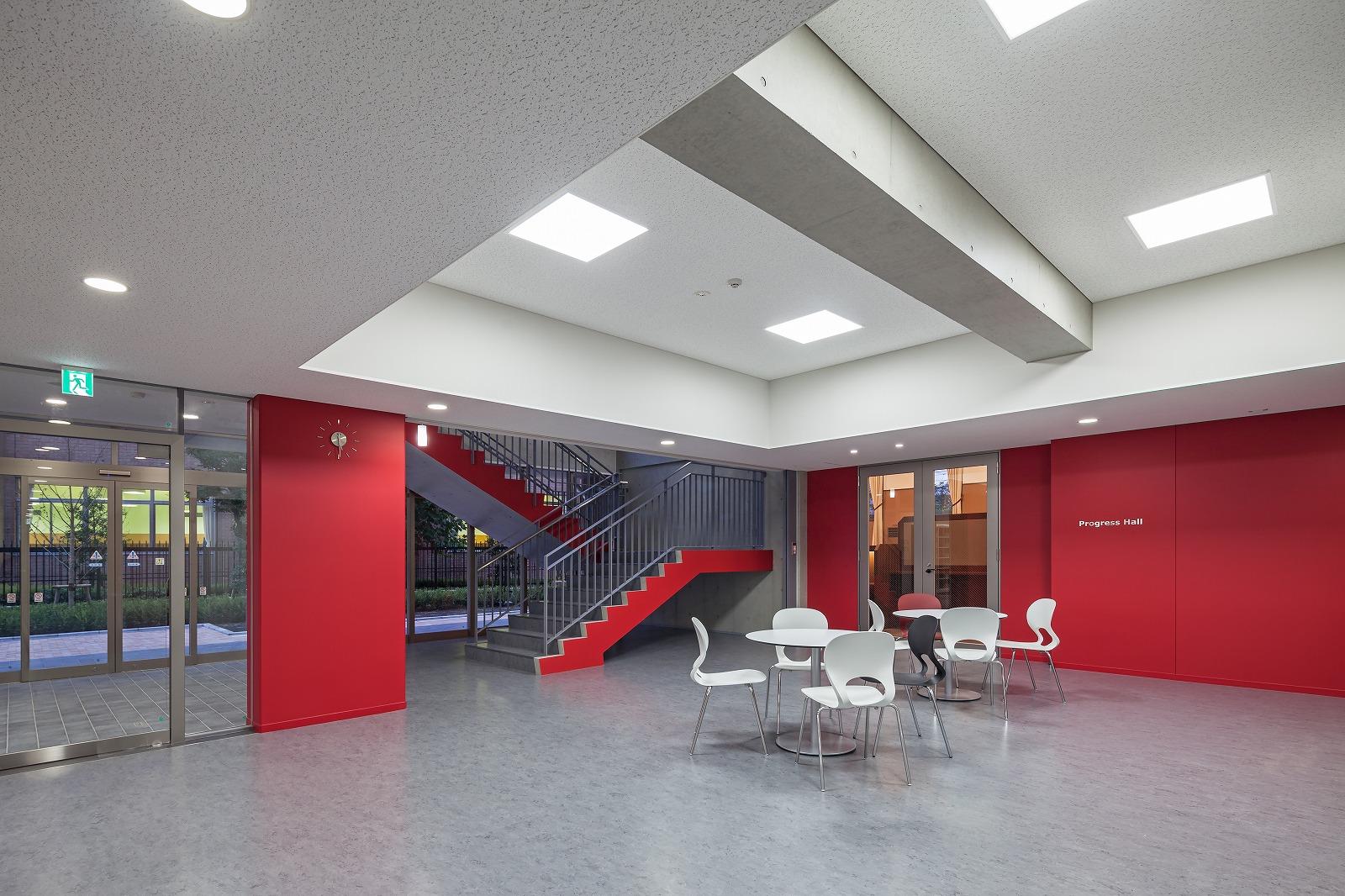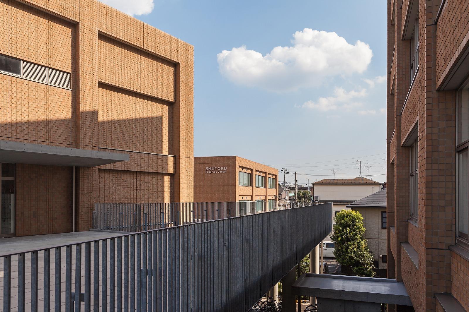校舎棟・プログレスセンターの「文」と体育館・グラウンドの「武」を、ペデストリアンデッキを介して「一体」とし、学園の基本方針である「文武一体」をカタチとして実現しました。 校舎は中庭を計画した事で、上下階の繋がりを感じられる明るく活気あふれる空間にした。体育館は開口部を多くとり、自然光と風の流れを感じられるアリーナと柔道場・剣道場で成っている。デッキは、それら2棟とグラウンドを繋ぎ、学園を一つにまとめる役目を担う。2期計画では、隣地にプログレスセンターと名付けられた受験学習専門の校舎も建てられ、3棟で一つの学園となった計画。