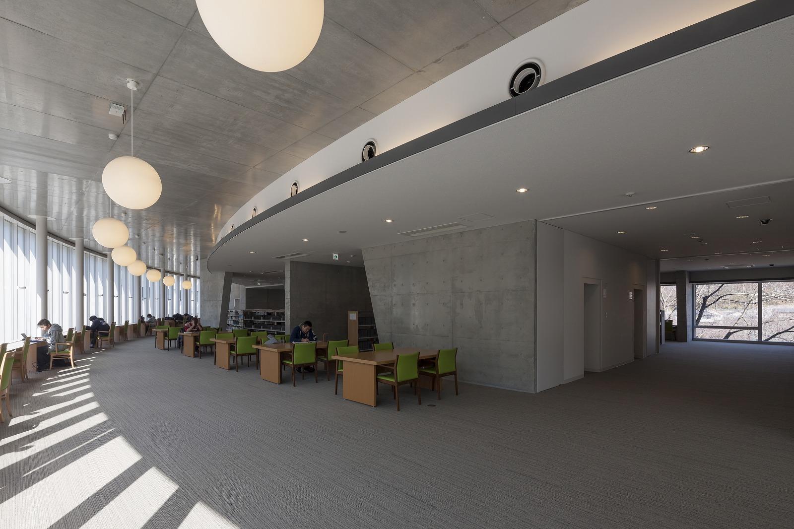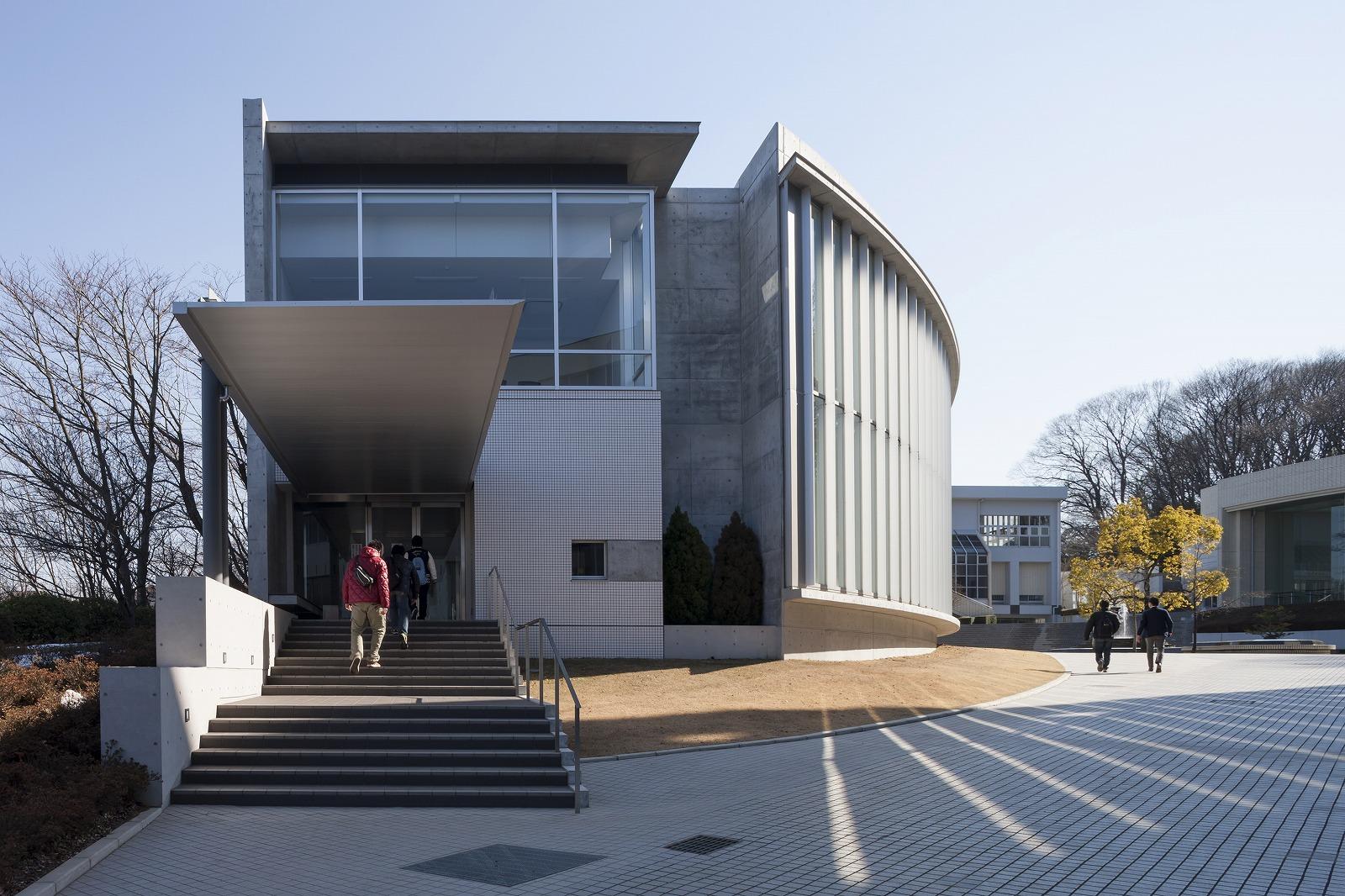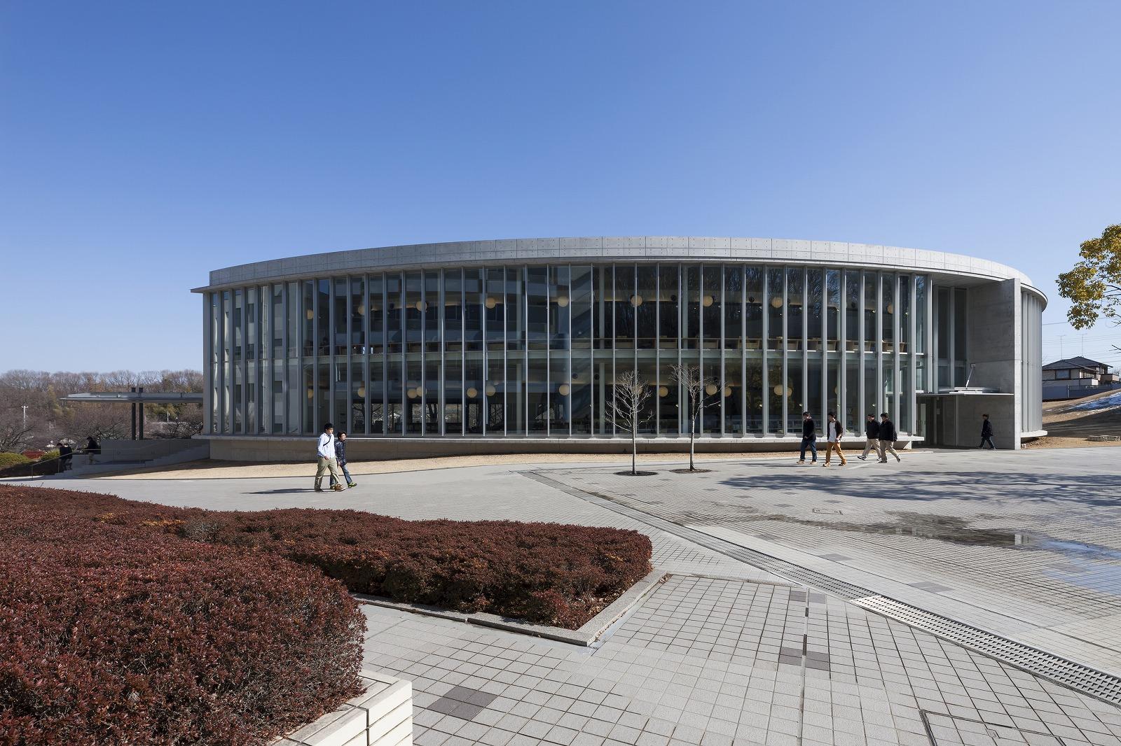 八王子市にある大学図書館の建替え計画です。キャンパス中央の広場に面して半楕円形状の建物を配し、広場側を曲面のガラスカーテンウォールとしました。全周に広い開口部を設け、キャンパスの自然との一体感を感じ取れる開放的な施設としています。 耐力壁で固められたコアの内部に書架を配し、周囲に閲覧スペースを配しました。カーテンウォールに沿って閲覧カウンターを設け、変化に富んだ読書環境を提供しています。構造にRC壁式フラットスラブ構法を採用。外周梁をなくし、逆台形の耐力壁で地震力を負担することで、外周柱は鉛直力のみを負担する径216mm のスレンダーな鋼管で構成しました。