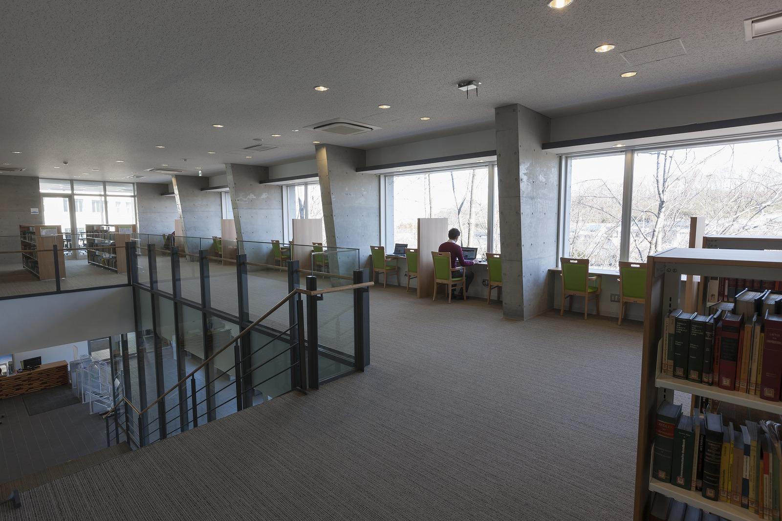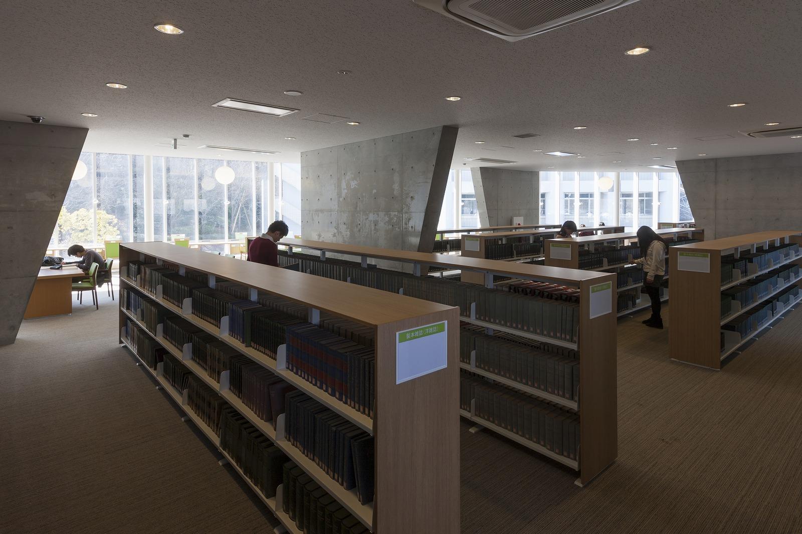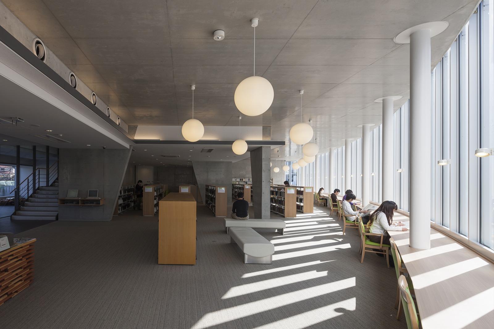 八王子市にある大学図書館の建替え計画です。キャンパス中央の広場に面して半楕円形状の建物を配し、広場側を曲面のガラスカーテンウォールとしました。全周に広い開口部を設け、キャンパスの自然との一体感を感じ取れる開放的な施設としています。 耐力壁で固められたコアの内部に書架を配し、周囲に閲覧スペースを配しました。カーテンウォールに沿って閲覧カウンターを設け、変化に富んだ読書環境を提供しています。構造にRC壁式フラットスラブ構法を採用。外周梁をなくし、逆台形の耐力壁で地震力を負担することで、外周柱は鉛直力のみを負担する径216mm のスレンダーな鋼管で構成しました。