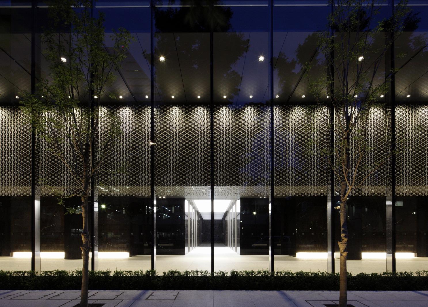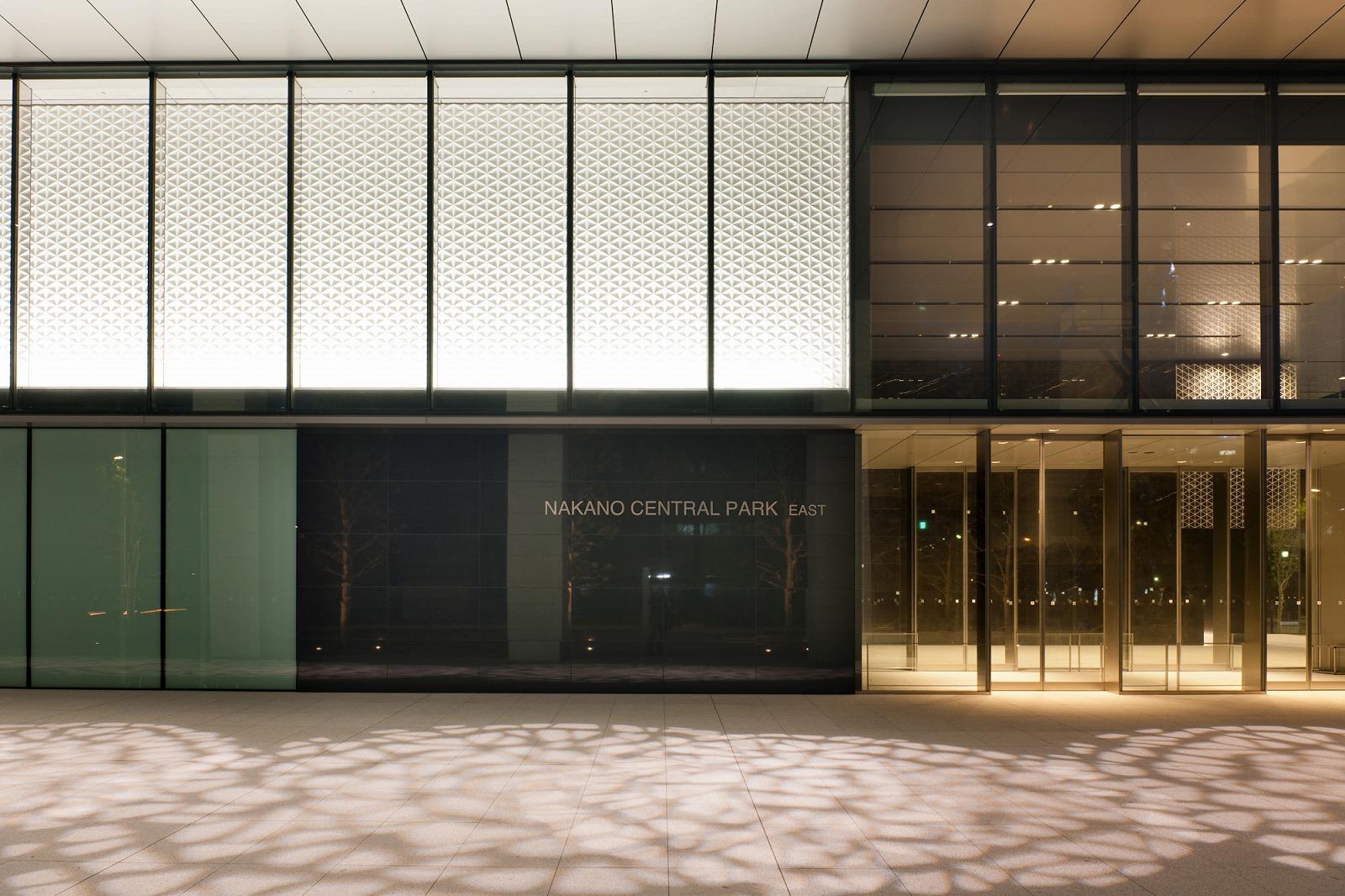 中野のにぎわいのプロムナード”をピロティ空間として建物内を貫通させることにより、中野駅前開発の将来的な賑わいの連続性を期待させるともに街区ゲートとしての表情を生み出している。また開発エリアの中央にある緑豊かな“中野四季の森公園”との関係性高めることを目指し、かつての武蔵野の記憶をつむぐため、過去から現在までの木々の再構築をテーマとしている。眼下に広がる都市計画公園のワイドビューを最大限享受できる巾3.6mのガラスカーテンウォールの採用、外構における既存樹木の再利用といった直接的な自然との関係性の構築である。もう一方が、武蔵野の木々をモチーフとしたエレメントによる記憶をつむぐデザインの展開であり、間接的な自然との関係性を呼び覚ますための配慮である。