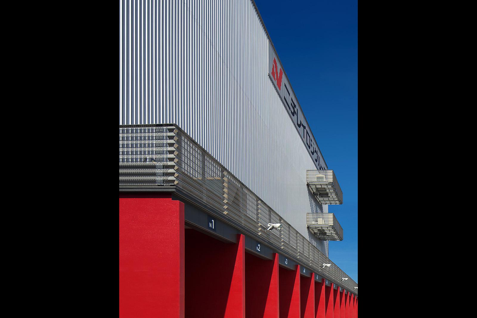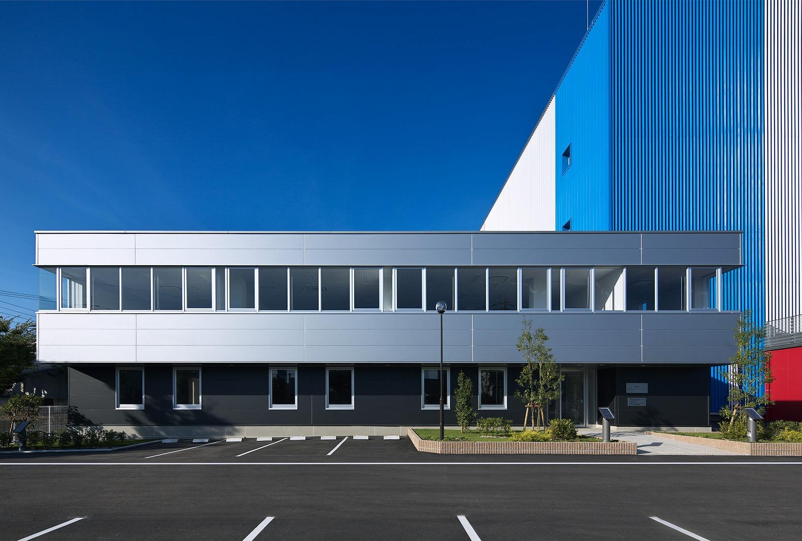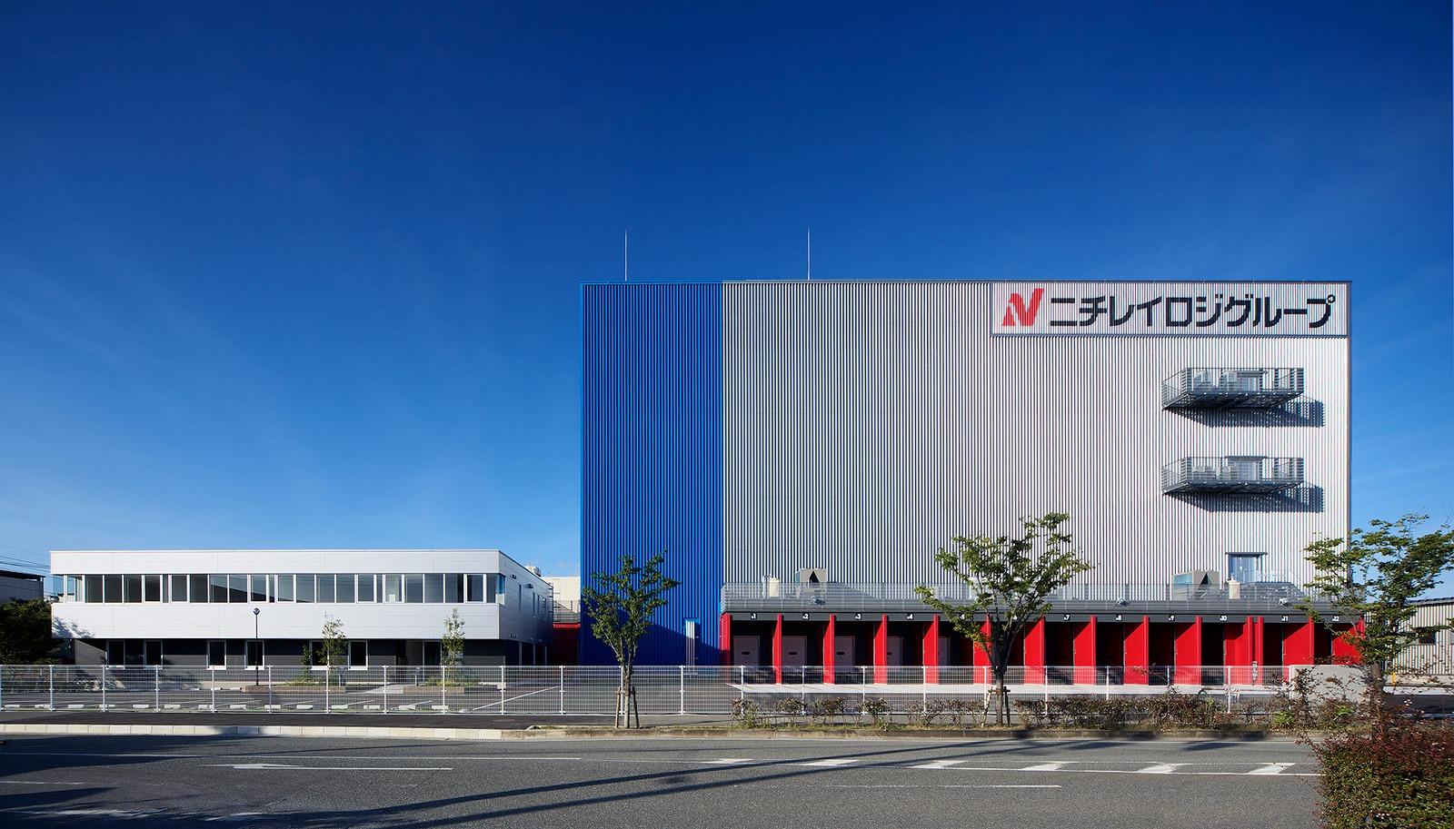 『博多の景色を意識したデザイン』 外壁は、冷凍倉庫としての機能性、耐久性から一般に屋根材として用いられる折版を採用。この折版の大きい凹凸が自然光の陰影により、博多湾の景色をやさしく映し出している。また地域に親しみのある博多湾の青、周辺に多くある神社の朱(ニチレイ様の赤)といぶし銀を外観のアクセントに採用。