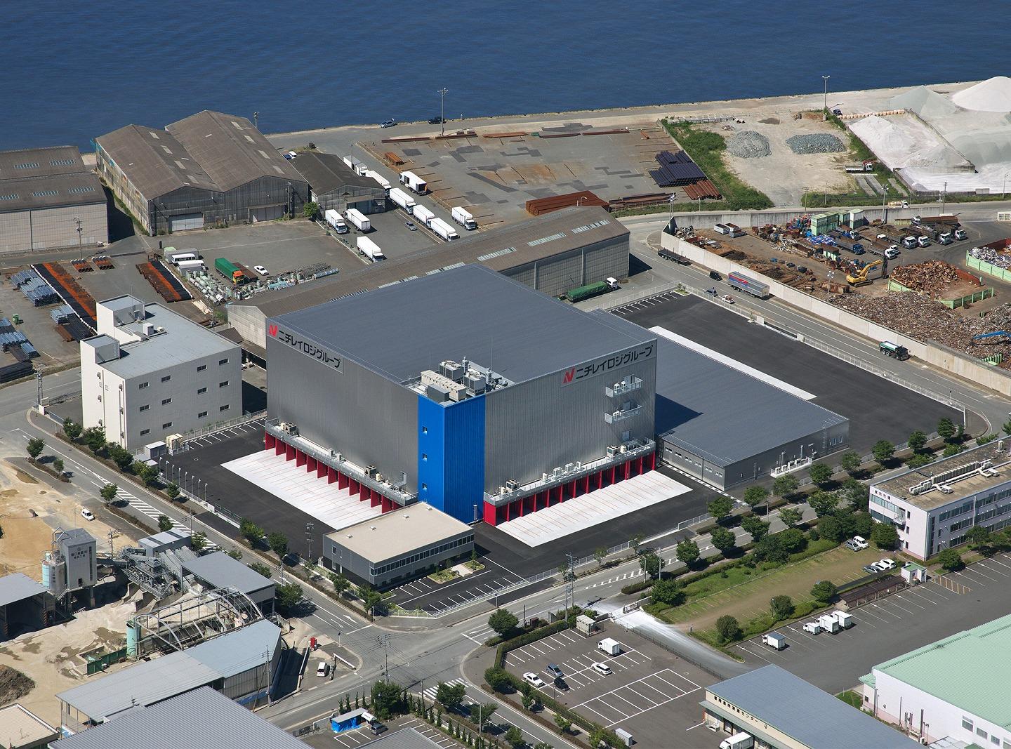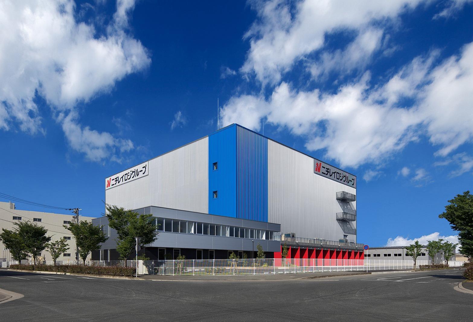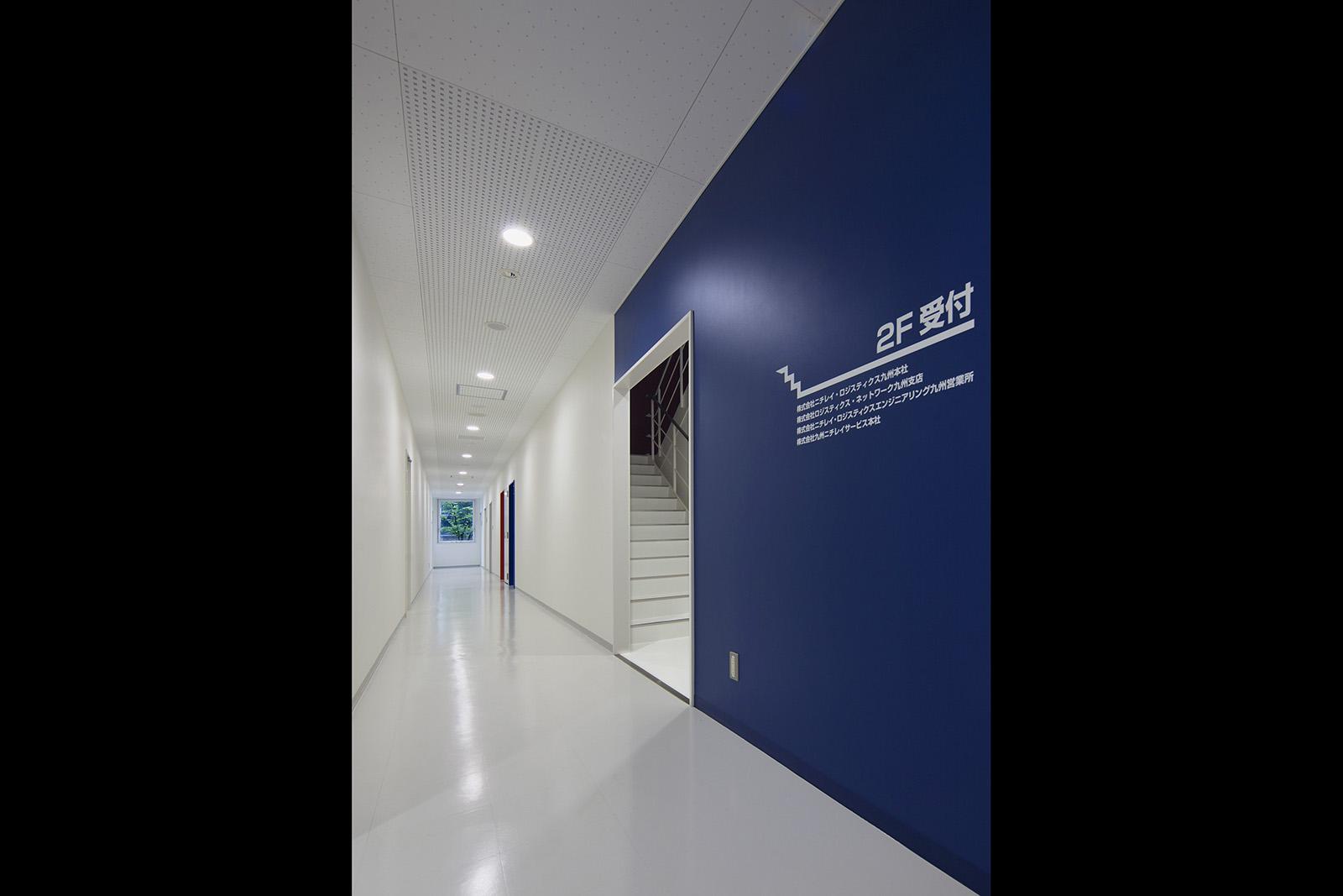 『博多の景色を意識したデザイン』 外壁は、冷凍倉庫としての機能性、耐久性から一般に屋根材として用いられる折版を採用。この折版の大きい凹凸が自然光の陰影により、博多湾の景色をやさしく映し出している。また地域に親しみのある博多湾の青、周辺に多くある神社の朱(ニチレイ様の赤)といぶし銀を外観のアクセントに採用。