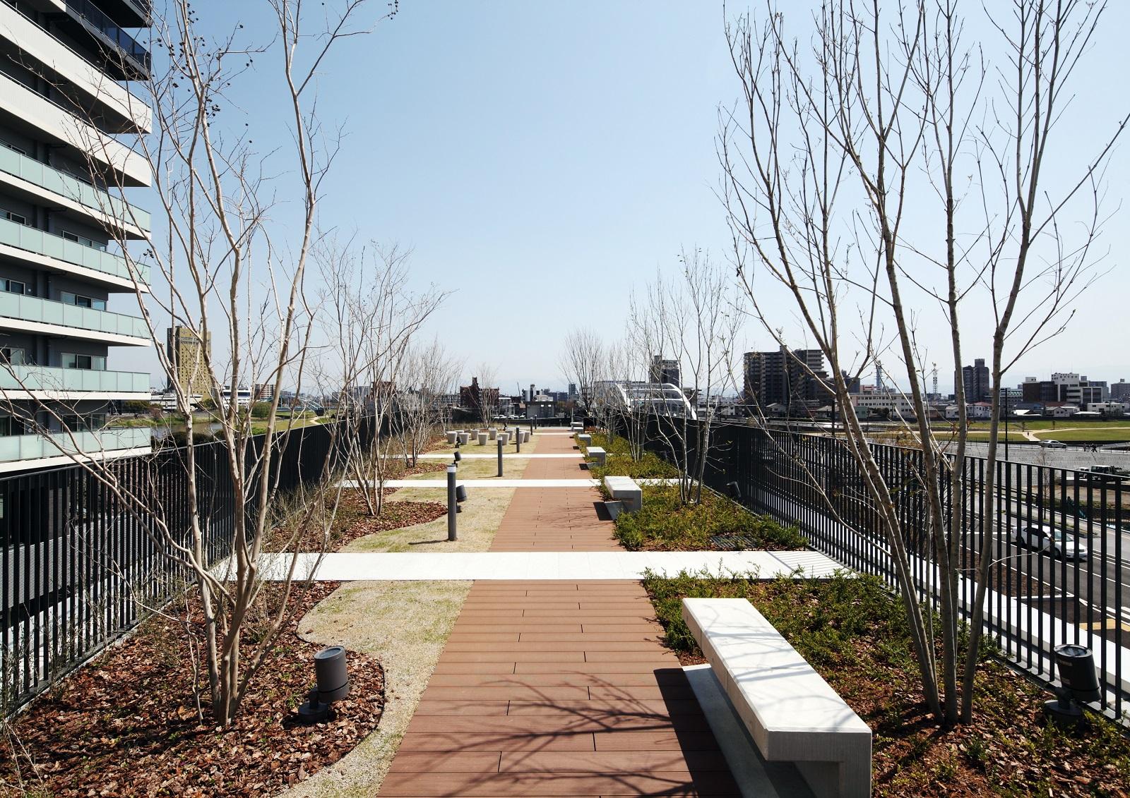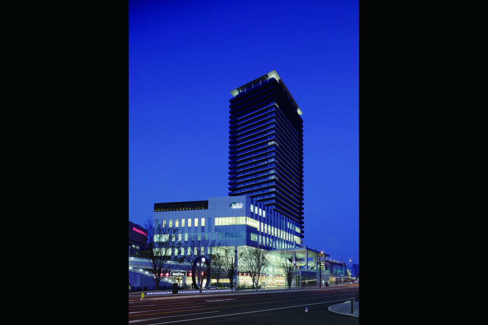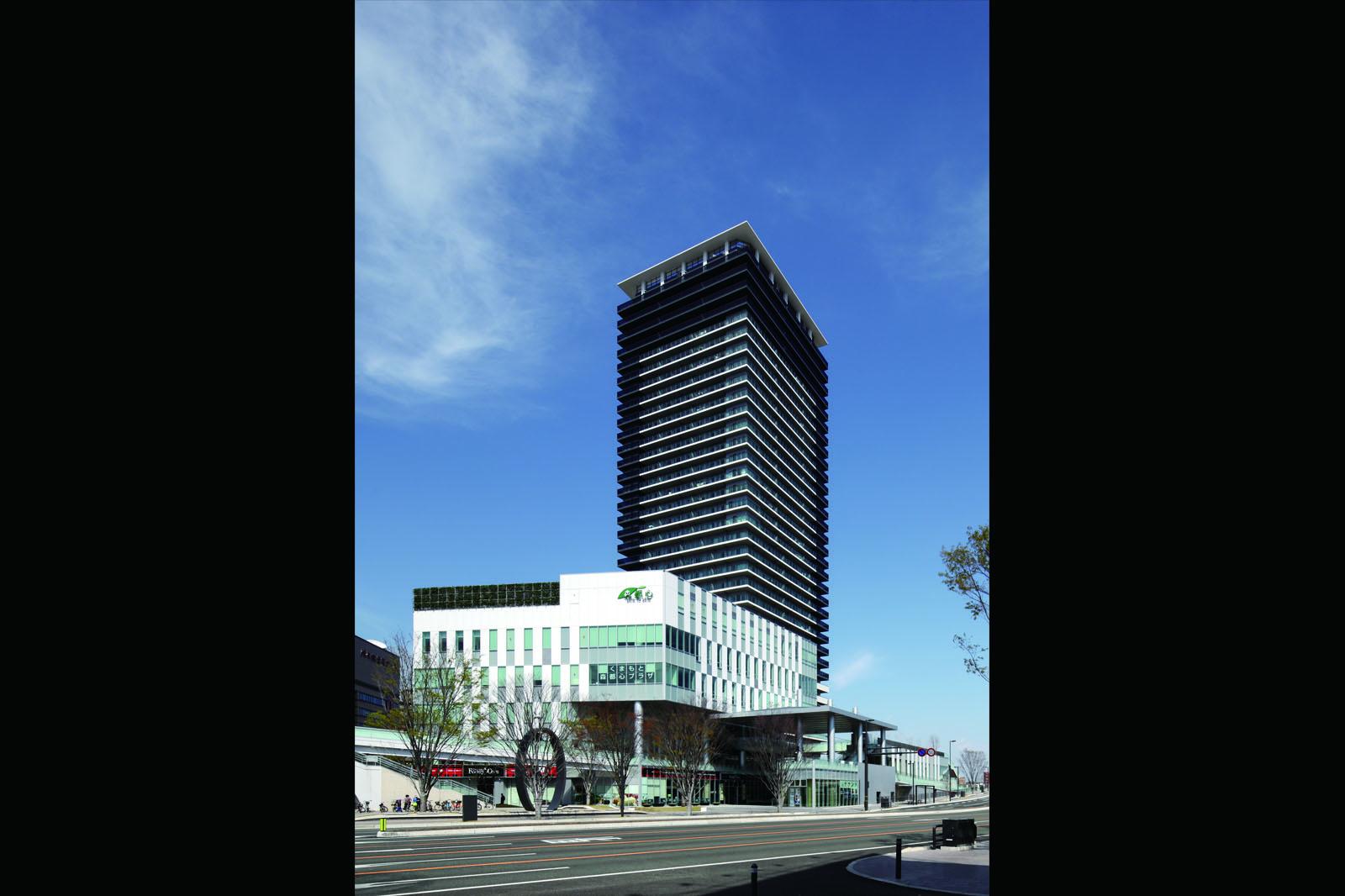 水と緑の都JR熊本駅東口の正面に位置する市施行による第二種市街地再開発事業であり、全国で初めての特定業務代行者と特定事業参加者を組み合わせた「建設業務代行者方式」による事業。事業提案競技により弊社を含むABILITY11が建設業務代行者に選定され、弊社は設計及び施工を担当した。 建物はA棟:市の図書館やホールを備えた情報交流施設と商業・業務施設、B棟:商業・業務施設と屋上庭園、C棟:高さ120m超・35階建の制振構造タワーマンションの3棟構成とし、駅前広場と坪井川の水辺広場とを結ぶ歩行者動線上には、大屋根を架けた“アトリウム”と水景施設のある“パティオ”を配置し、賑わいのプロムナードを形成している。