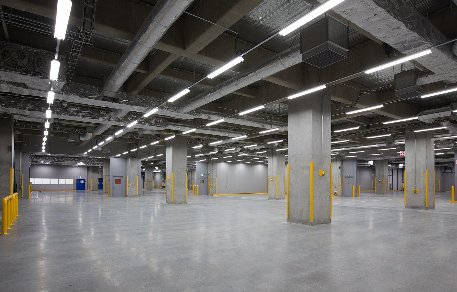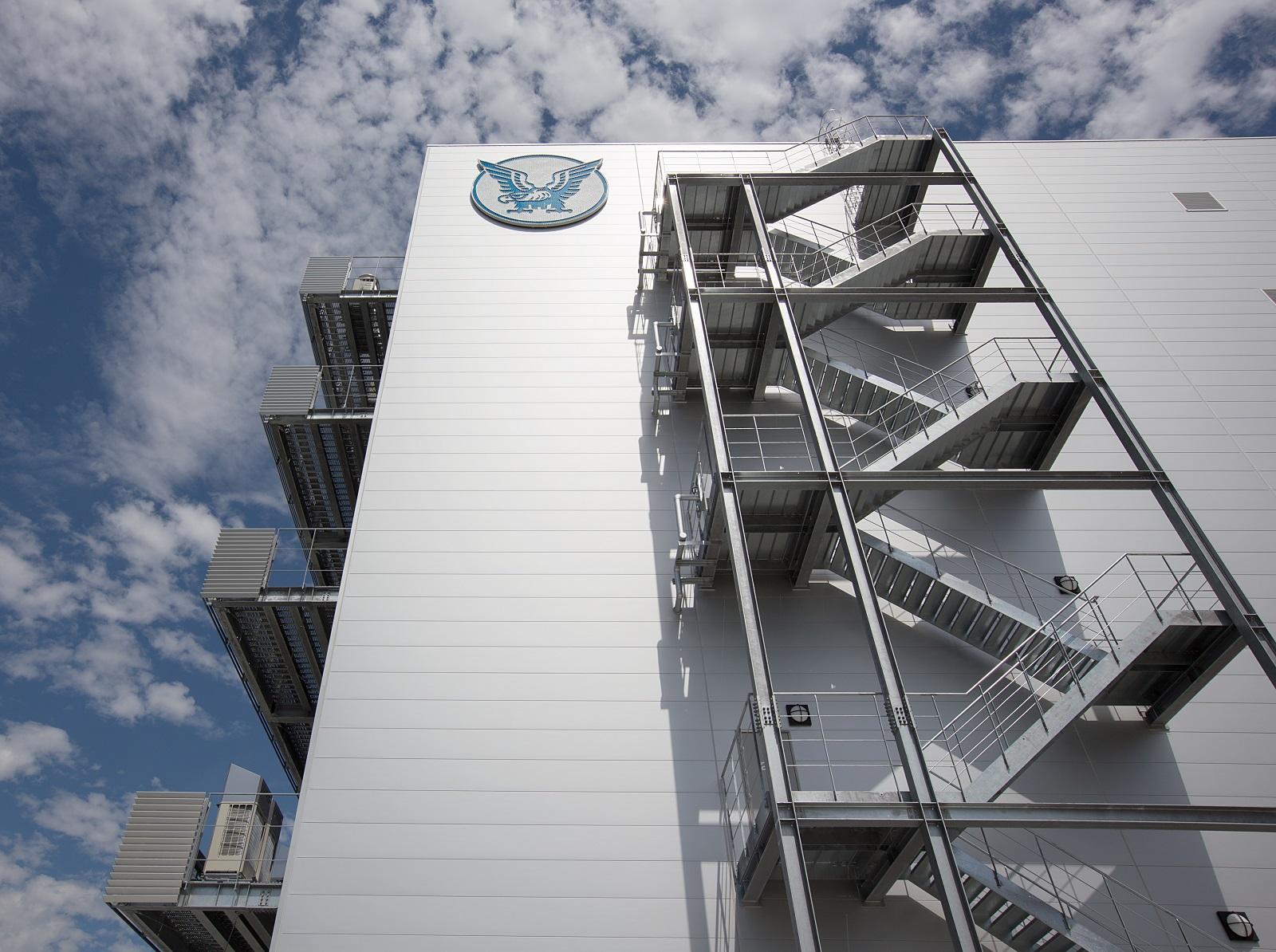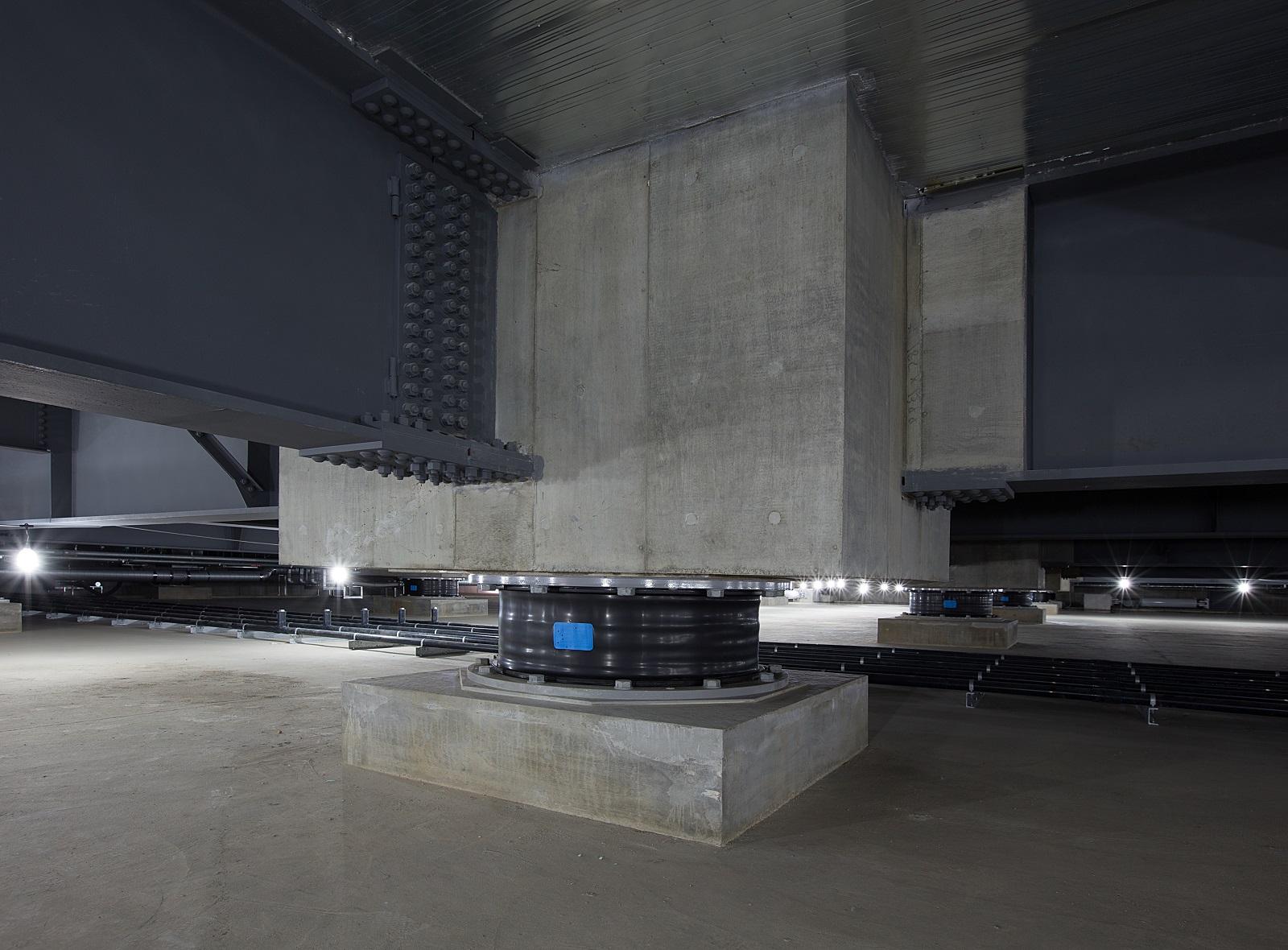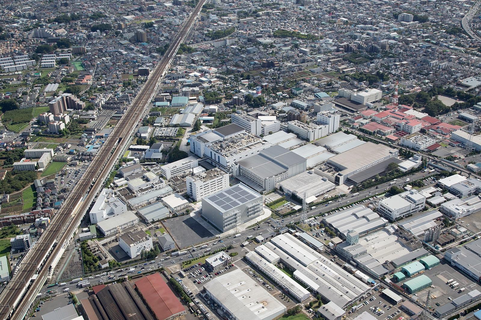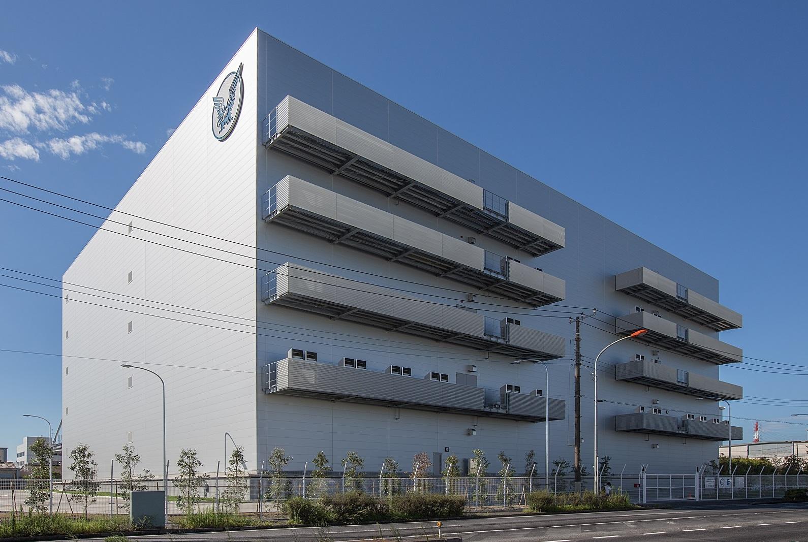 顧客の基幹工場における大型免震物流倉庫のプロジェクトである。合理的・効率的な保管空間の確保に加え、「災害に強い建物」「災害後の早期出荷が可能な建物」という顧客ニーズに対し、戸田式免震工法(TO-HIS工法)を採用し、耐震性・機能性・経済性に優れた大型物流倉庫を実現した。 RC柱と鉄骨梁の組合せによる大空間の確保とともに、基礎梁の格子状ダブルビーム工法など、戸田建設の技術力を活用している。外観は工場全体のデザインを踏襲しつつ、マッシブなボリュームにバルコニー/ロゴサインによるアクセントを加え、国道・高架鉄道からの見え掛かりに強い訴求力を付加した。