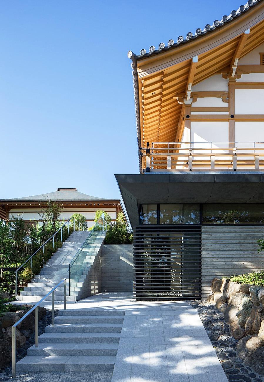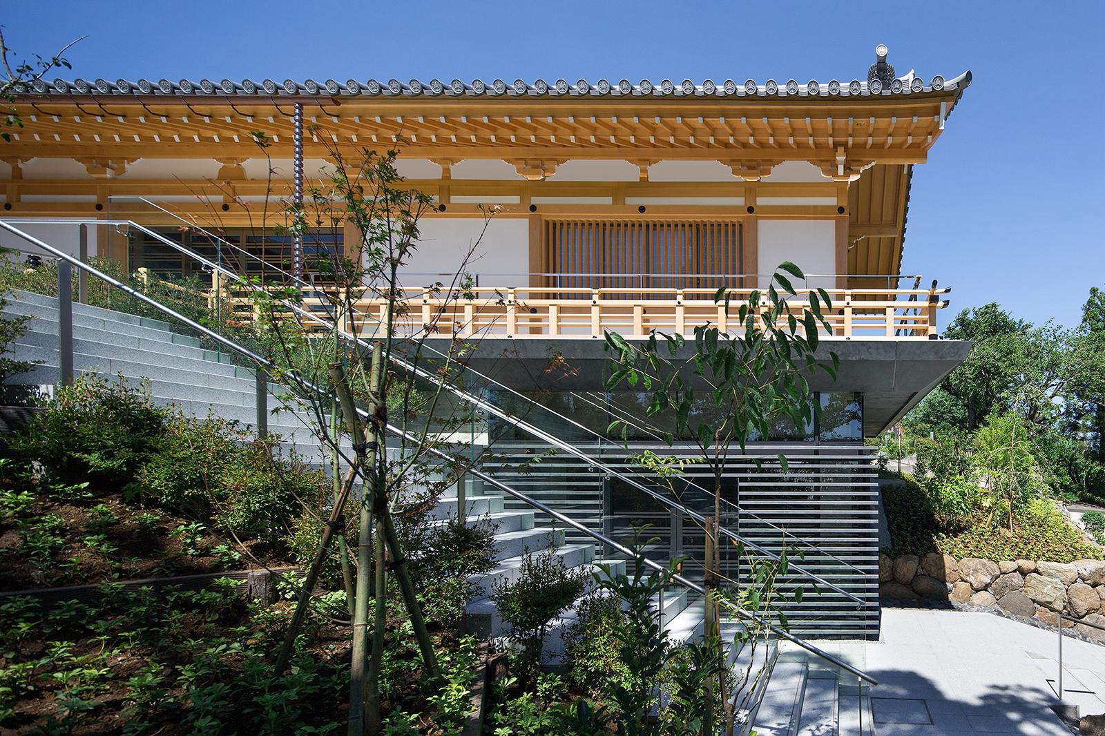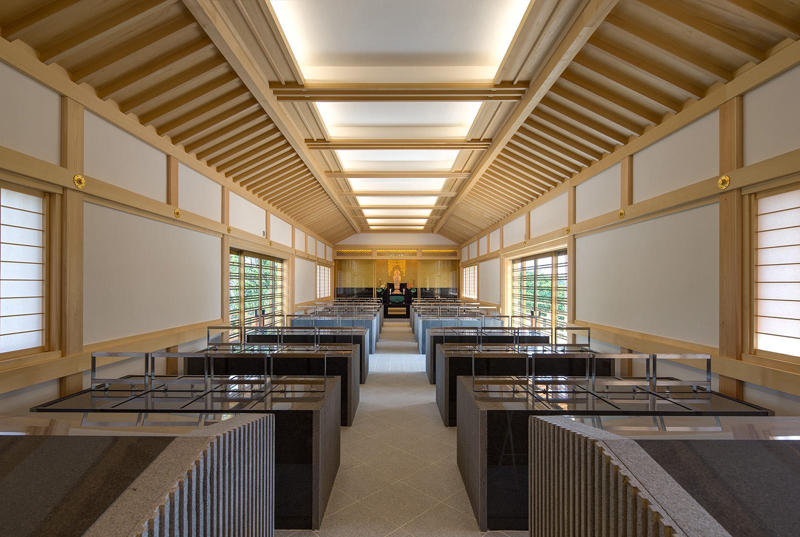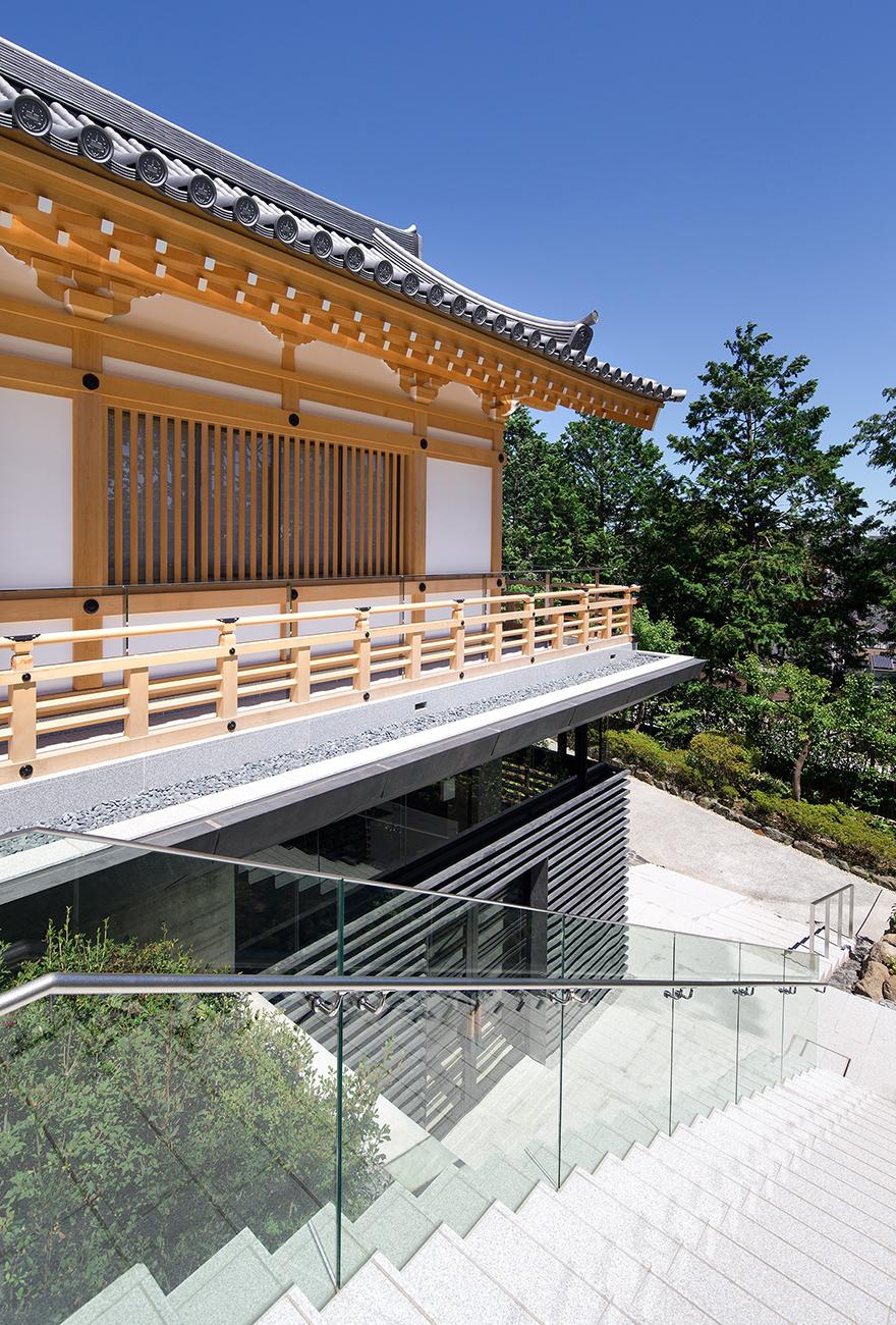 既存境内に立地する納骨堂は、後世に残る格式のある建物という施主の想いを受け、地上部は木造社寺建築の様式であるが墓地埋蔵法の準耐火要件をクリアする為、鉄骨造としている。伝統社寺建築の木割に沿った仕様、寸法体系の中に鉄骨構造部材を違和感なく納めている。又斜面地に立地し本堂他既存建物との調和や新たな『場』による境内の空間価値の向上を目指して計画。地下1階部分は半地下で斜面側がをオープン形状とし地上部の伝統建築を地下部の現代建築で受ける形態としている。高欄を巡らした回廊下端にスリットガラスを設け、浮遊感を持たせて現代建築と伝統建築の共生を図っている。内部は納骨壇(墓地形状)・納骨ロッカー・位牌棚で構成。地下の納骨室内部は将来計画としてスケルトンとなっている。