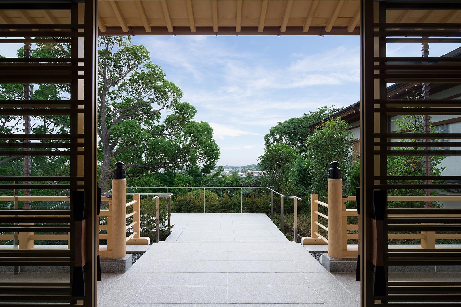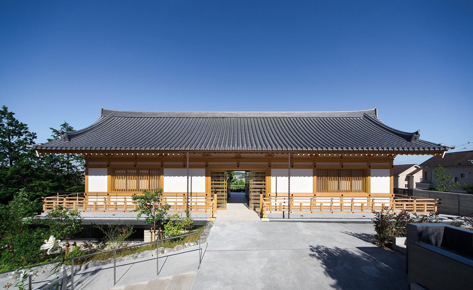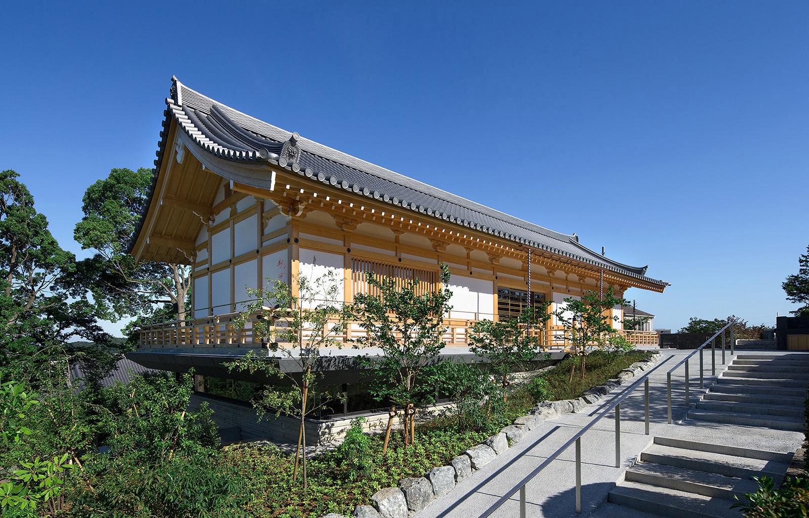 既存境内に立地する納骨堂は、後世に残る格式のある建物という施主の想いを受け、地上部は木造社寺建築の様式であるが墓地埋蔵法の準耐火要件をクリアする為、鉄骨造としている。伝統社寺建築の木割に沿った仕様、寸法体系の中に鉄骨構造部材を違和感なく納めている。又斜面地に立地し本堂他既存建物との調和や新たな『場』による境内の空間価値の向上を目指して計画。地下1階部分は半地下で斜面側がをオープン形状とし地上部の伝統建築を地下部の現代建築で受ける形態としている。高欄を巡らした回廊下端にスリットガラスを設け、浮遊感を持たせて現代建築と伝統建築の共生を図っている。内部は納骨壇(墓地形状)・納骨ロッカー・位牌棚で構成。地下の納骨室内部は将来計画としてスケルトンとなっている。
