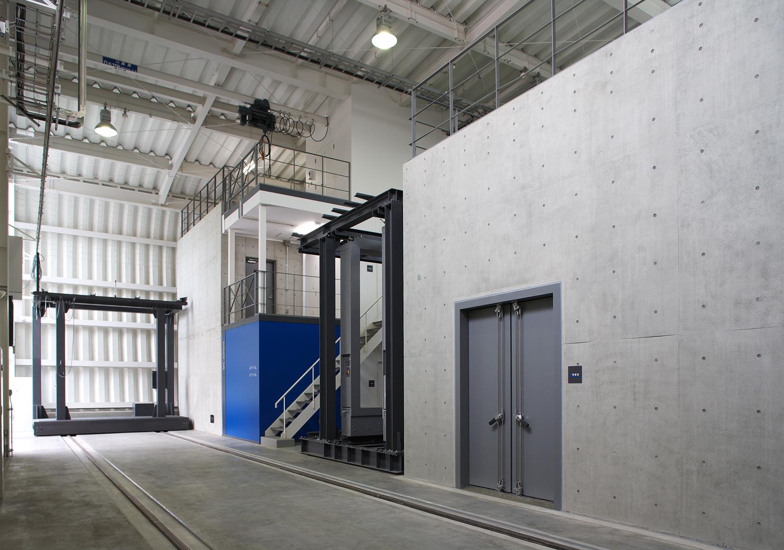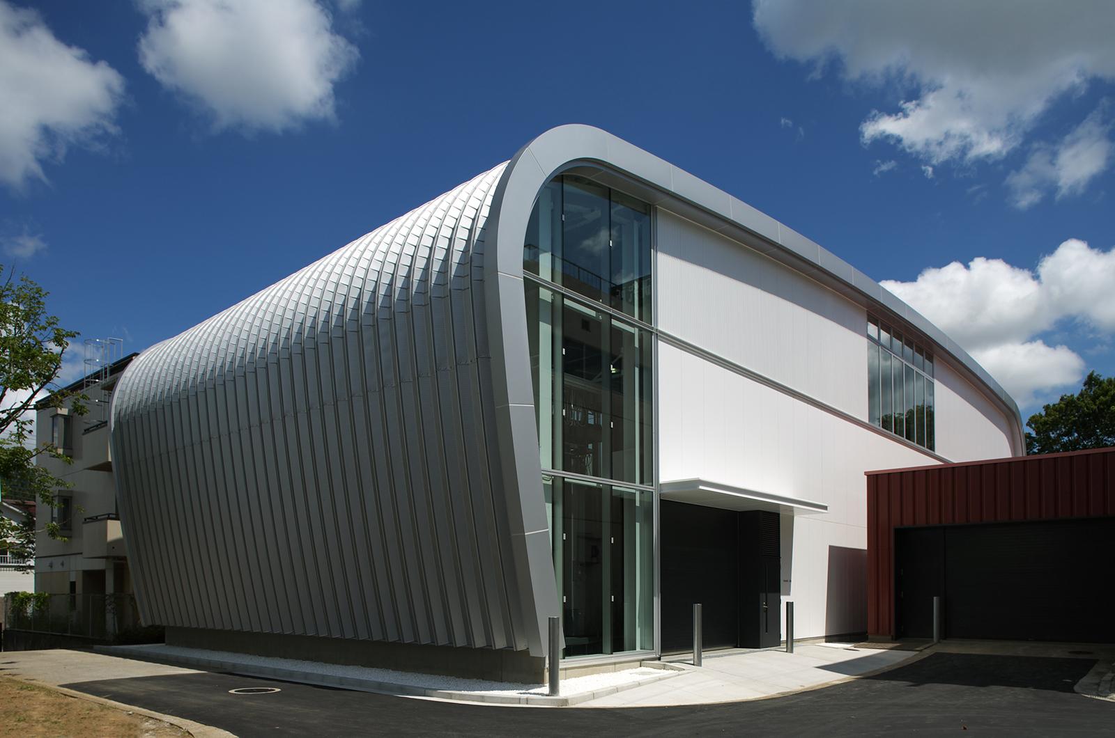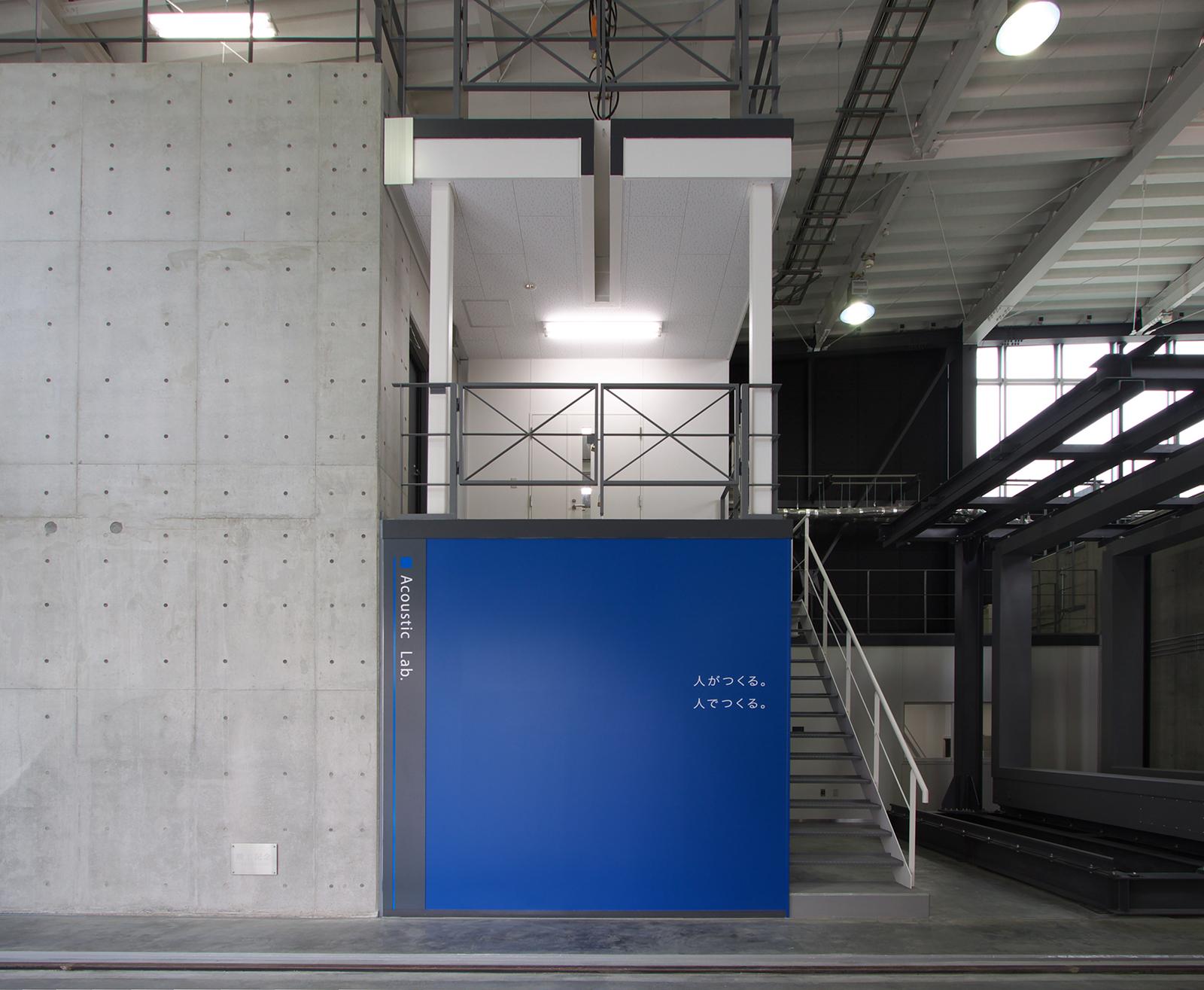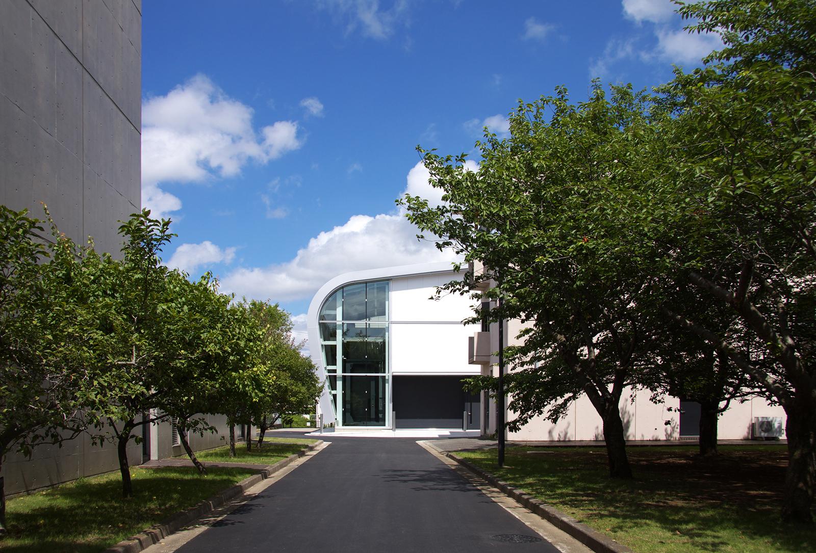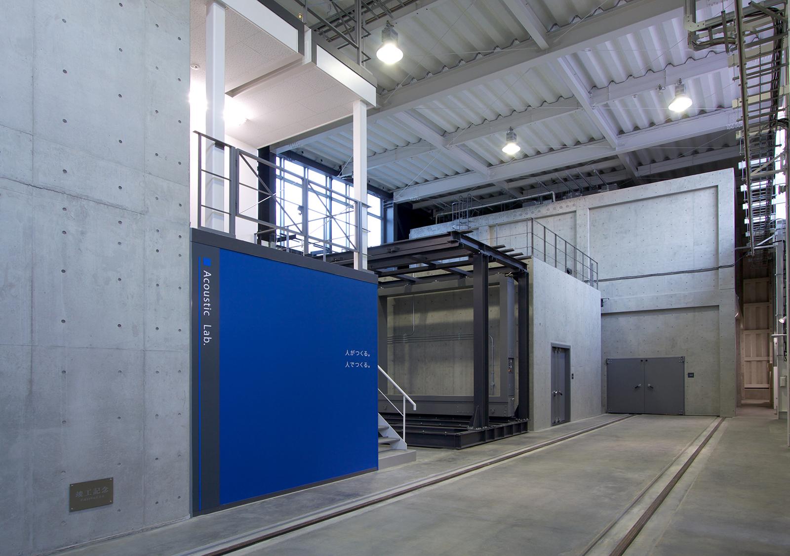 本施設は、無響室・残響室・箱型実験室の3つのコンクリート打放しによる実験施設と、ストックヤード、計測室等で構成されている。これらの実験施設を、特徴的な曲面屋根の建屋で覆うことにより、必要とされる遮音性能を向上させる計画とし、存在感があり、次世代を印象付ける建築計画としている。