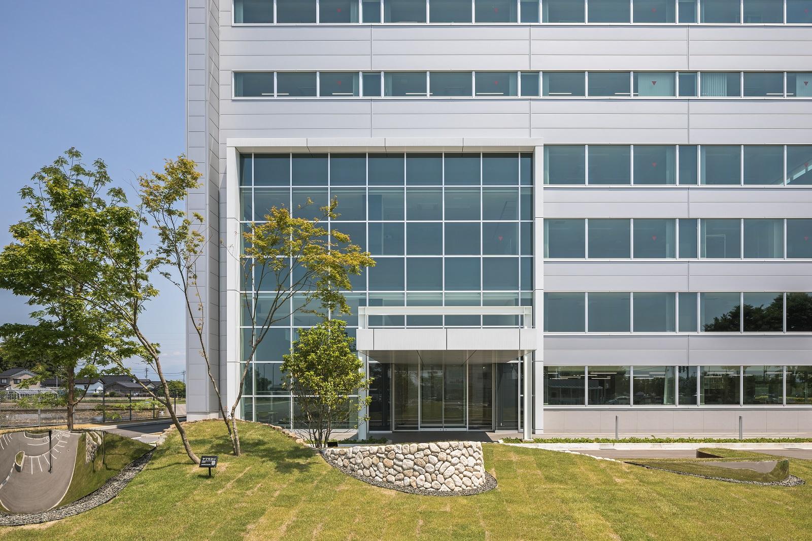 広大な事業所の正面に位置する工場であり、事業所の「顔」としての設えを求められた。外壁に突出した袖壁を設け、エントランス部に12m角の大きなカーテンウォールを配し、来訪者を受け入れるエントランスゲートとしての外観を構成した。