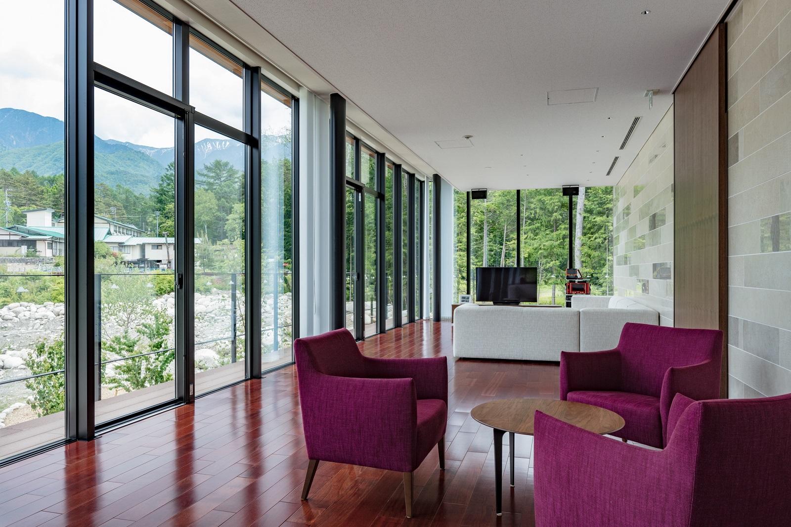 敷地はそんな四季折々の美しい山々を楽しませてくれる自然豊かな別荘地である。長野県を代表する御嶽山、木曽駒ケ岳を東西に構え、その美しい景色を楽しみながら、最高の週末を過ごして頂く為の、VIP向けの迎賓空間である。
