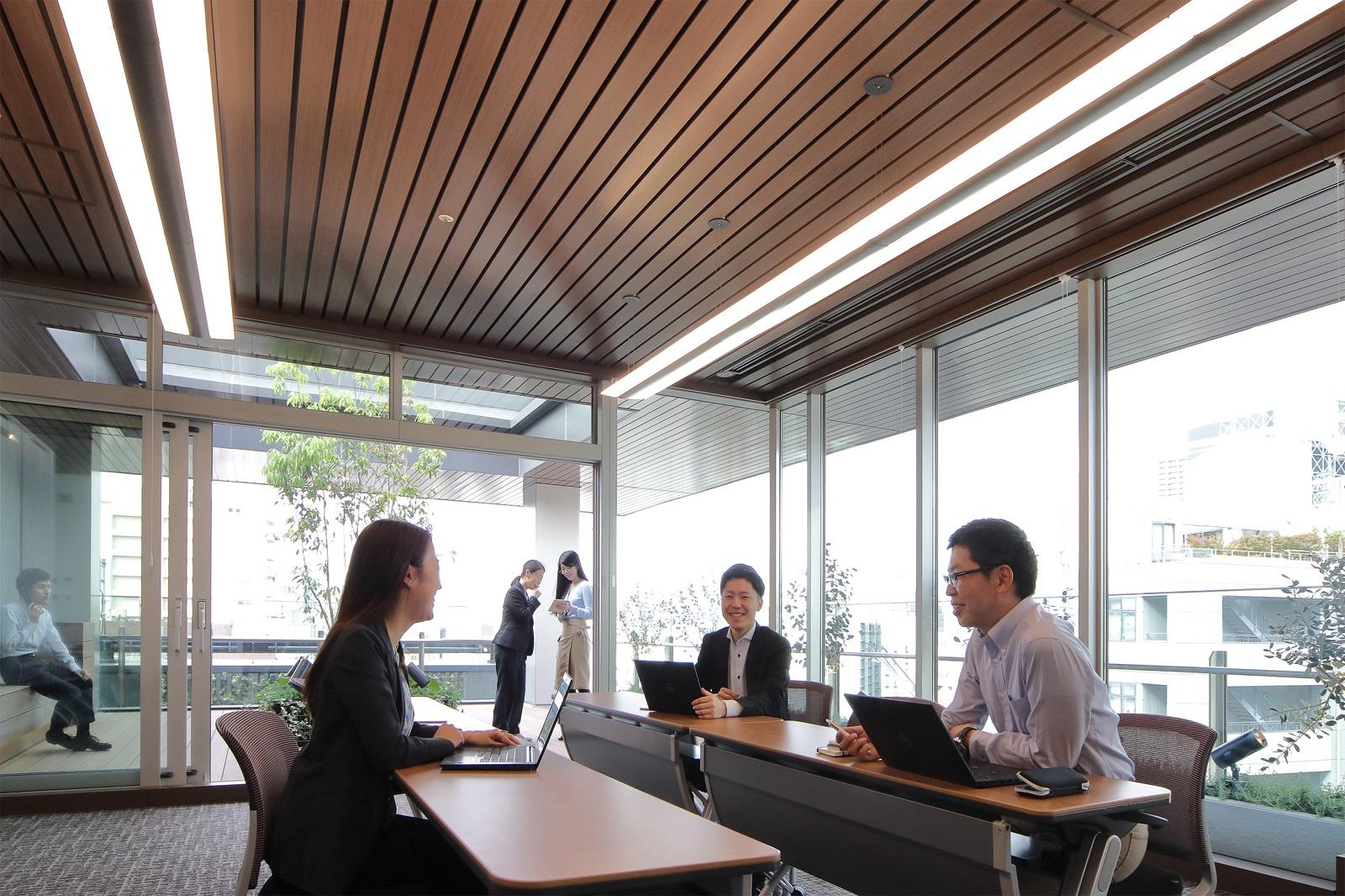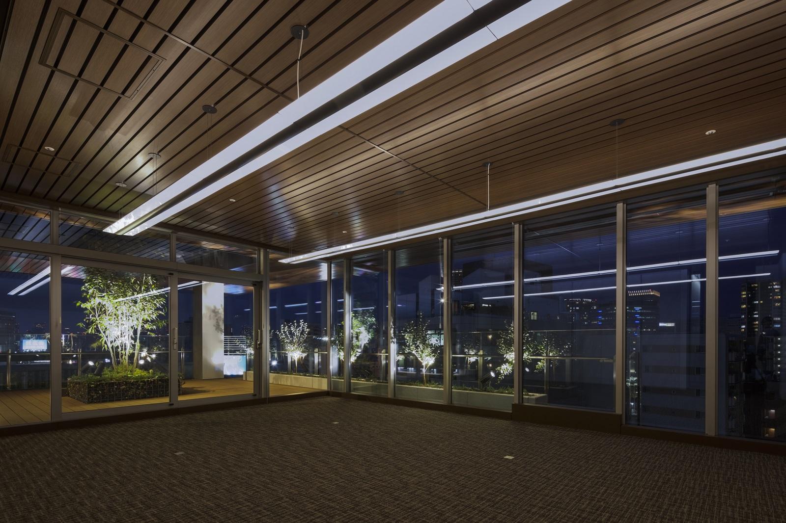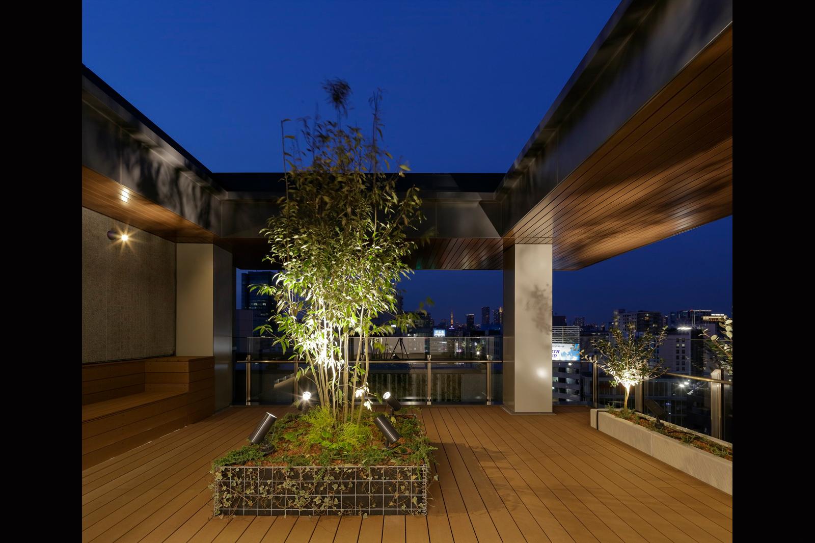 設計を始めるにあたって、西五反田1丁目交差点に安らぎある風景を作りたいと考えた。それは会議室の利用者だけではなく、交差点を歩く人にも豊かな風景を生み出し、地域に愛され、それがビルとしての価値を高めていく事を期待しているからである。この風景を実現する為、大きな木目調の庇を屋上会議室に据え、そこに木々の揺らぎを映し込むことを計画した。これにより、五反田のスカイラインに安らぎある風景を生み出している。そして、この会議室は「SGテラス」のみならず、近隣ビルや地域にも開放し、地域のリビングとして機能していくことを期待している。またオフィスフロアでは、通常は場所が指定されている給湯室の位置を選択制とし、男女比に合わせて改修しやすいトイレを計画した。更にBCPと快適性を兼ね備えた計画として、自然光が差し込む共用部や自然換気窓の設置等を行い、働く人が開放感を感じられるようになっている。