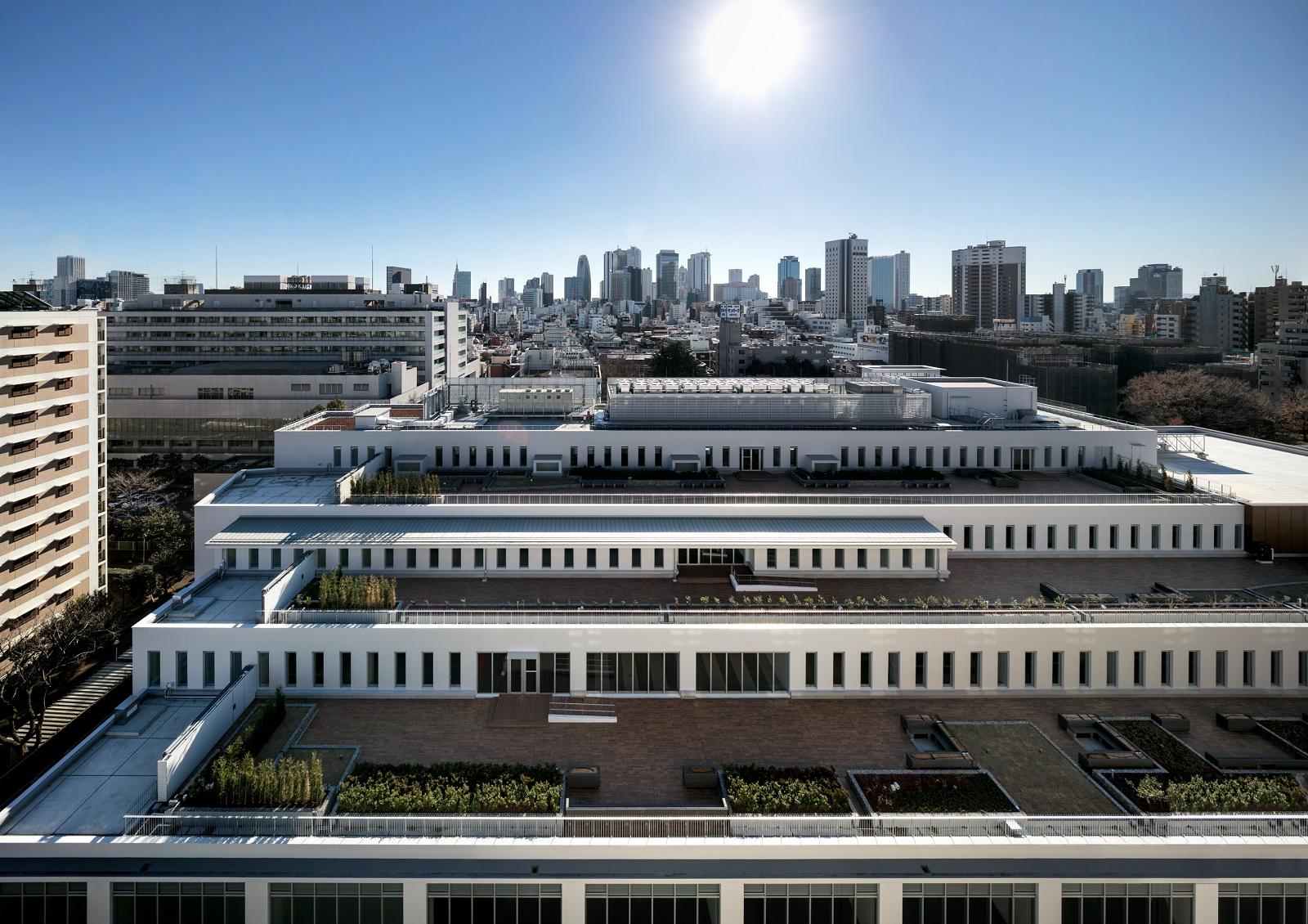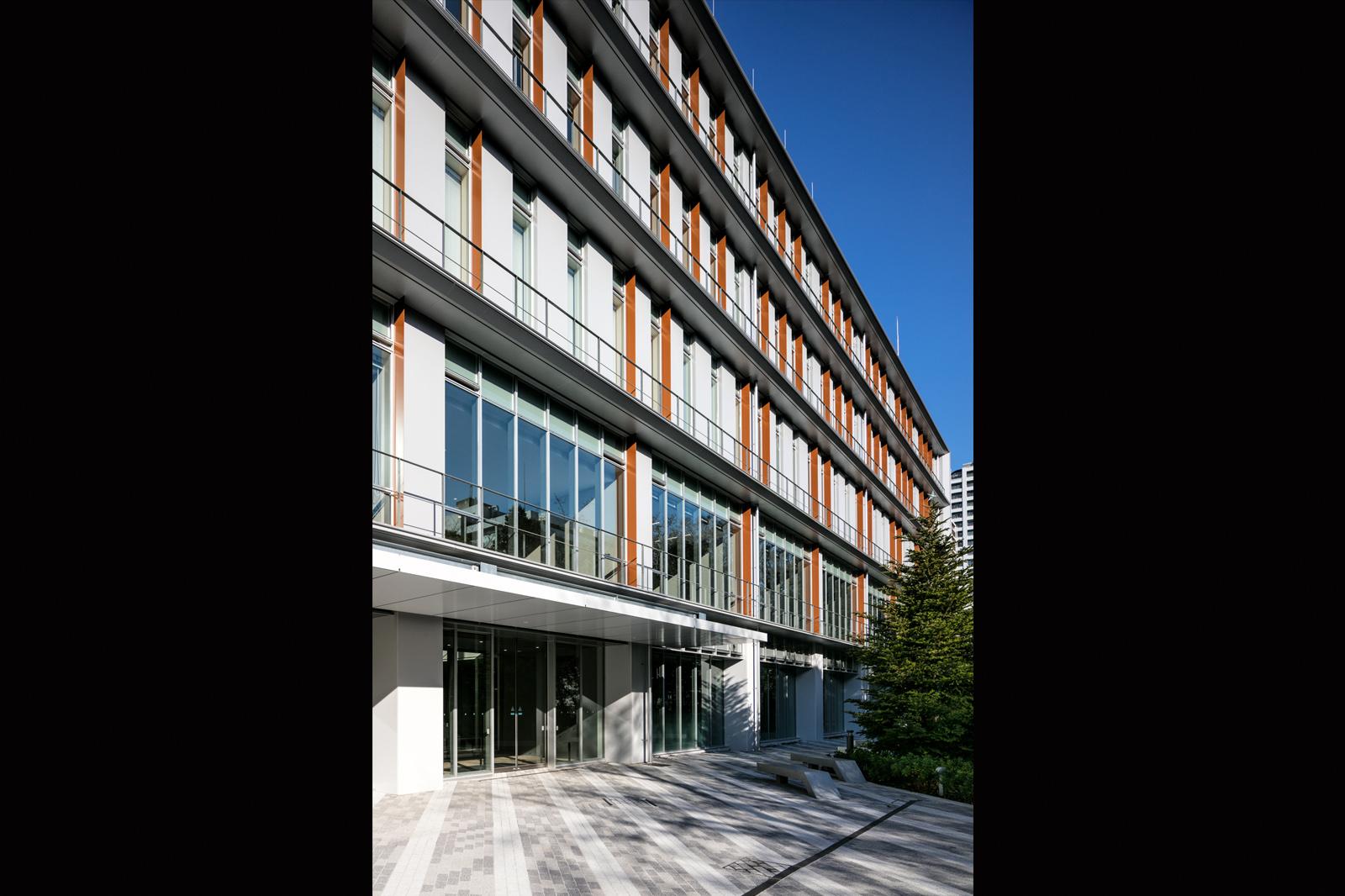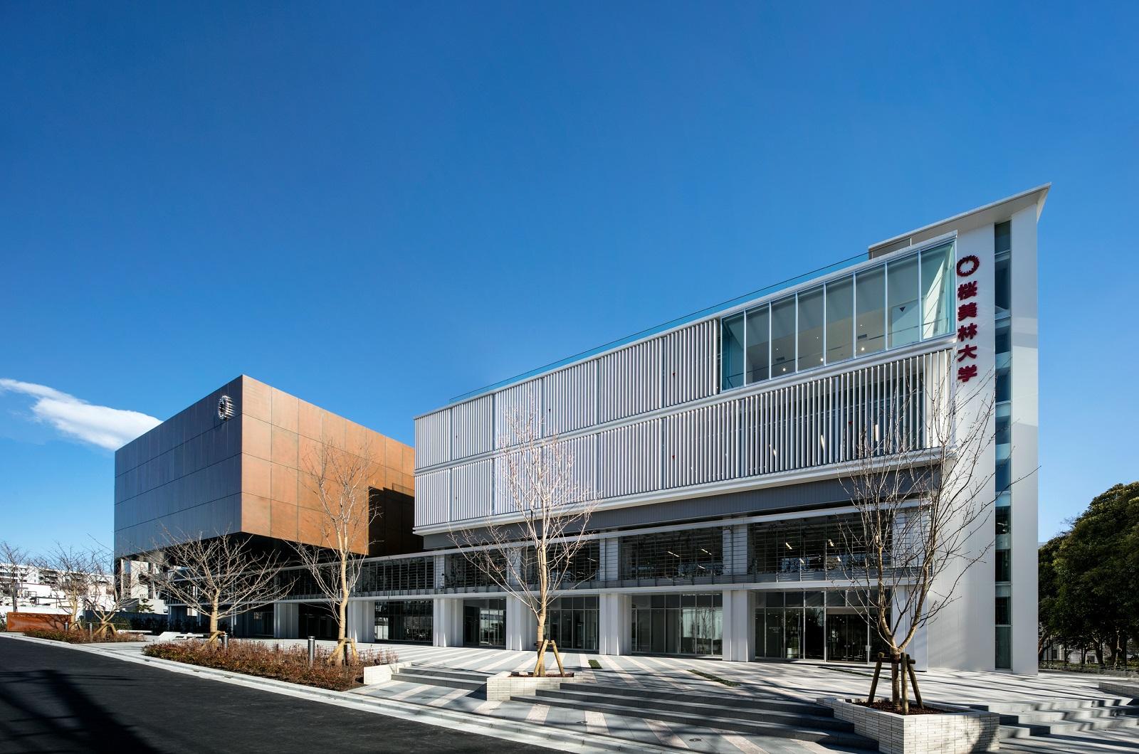 地域に開かれたキャンパス「University Without Walls」の理念に基づき、前面道路から建物を大きくセットバックさせ、アプローチ空間を前庭として整備し、人が溜りコミュニケーションが誘発される場を創り出した。建物ファサードは、多目的ホールを内包するマッシブなボリュームを白を基調とした外壁から大きく跳ね出させることにより、大学施設としての力強い個性を表現した。また、2階レベルには、60mを超える壁面緑化を施し、桜並木とともに人と建物と街を緑で繋ぐことを試みた。