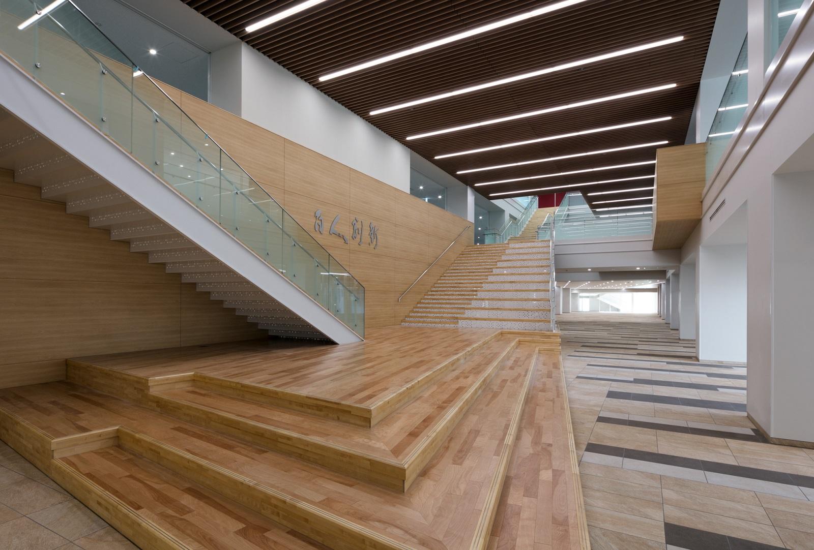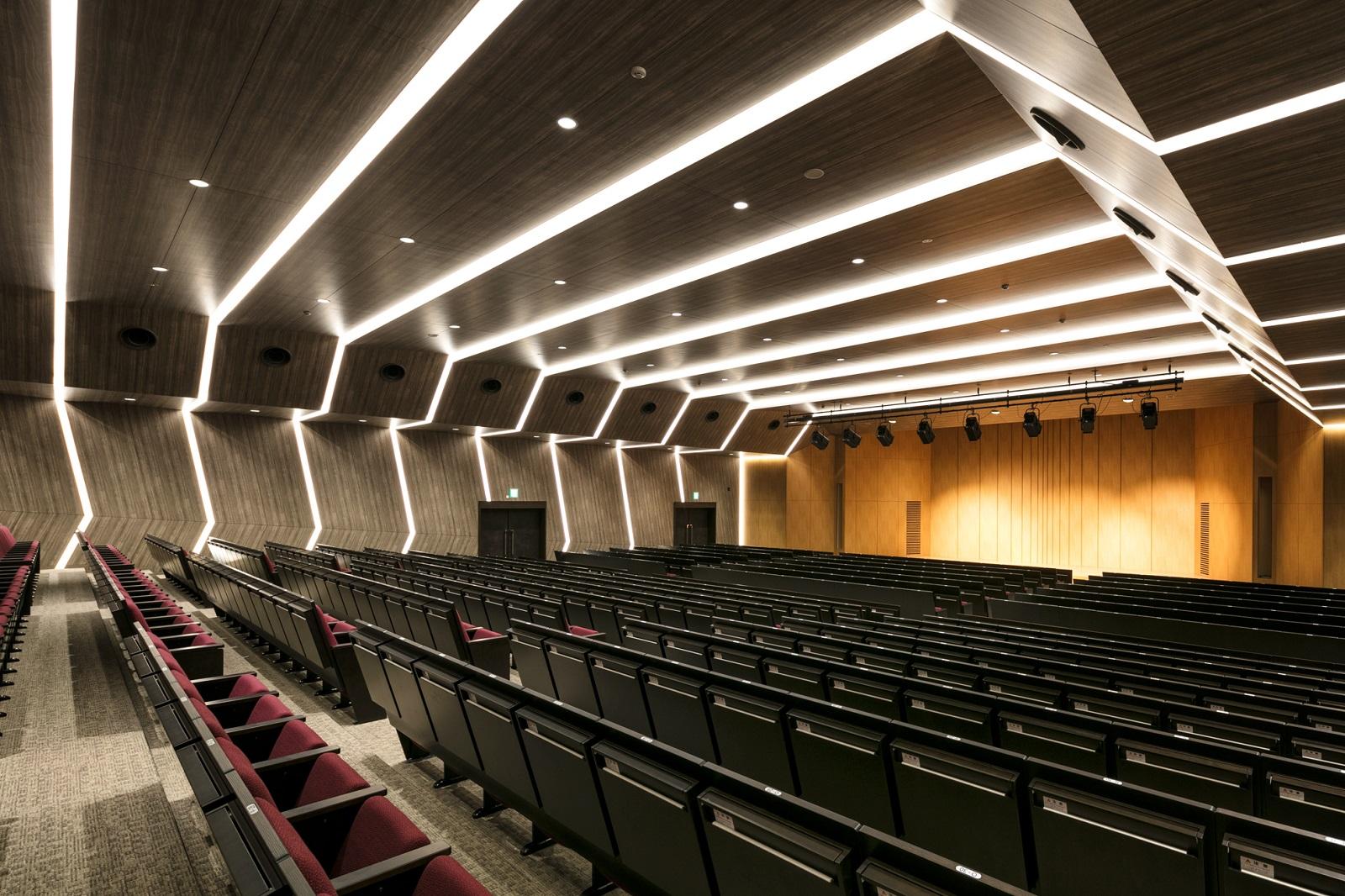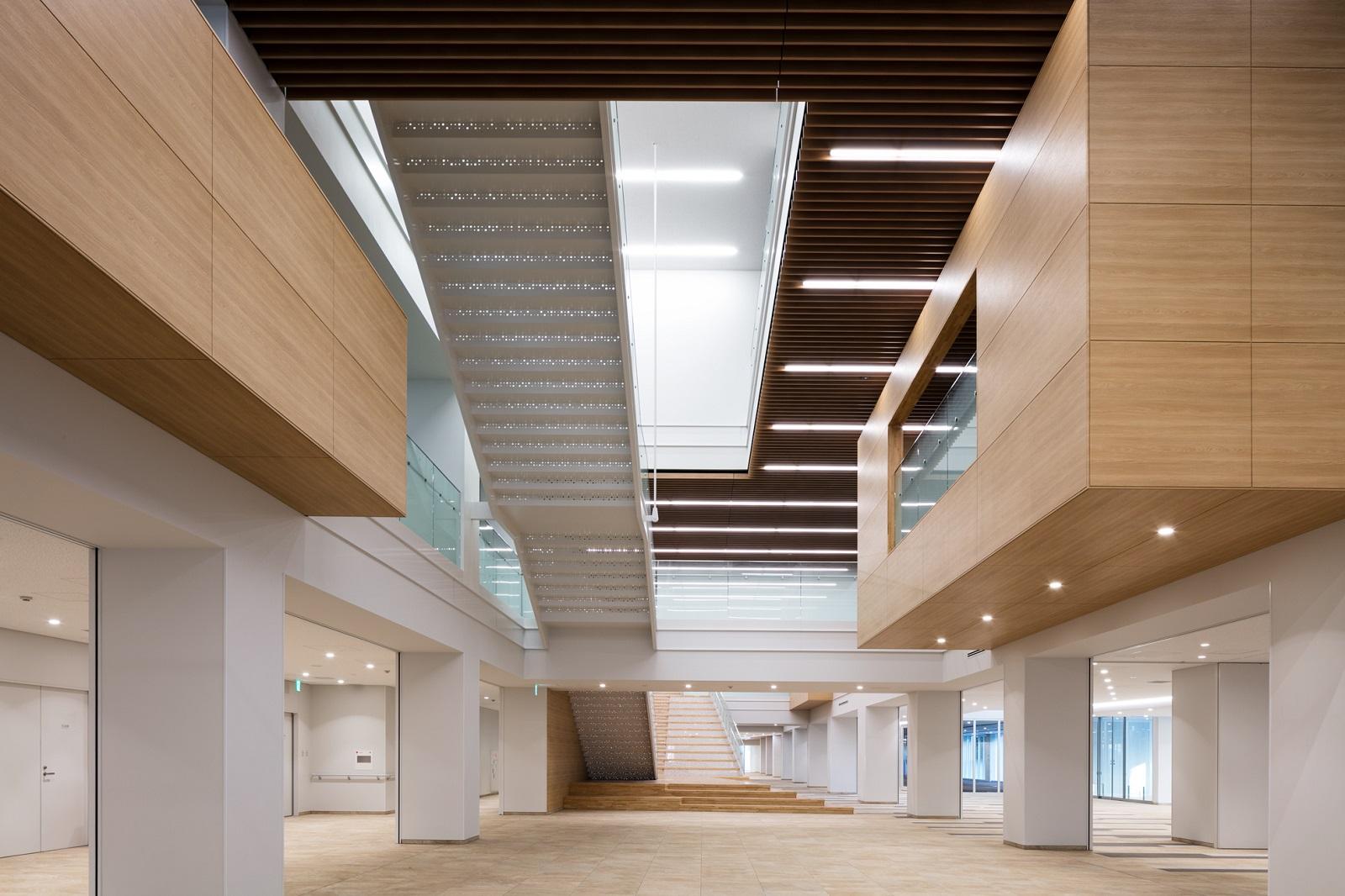 建物内部では、奥行き100mを超える長大な空間を活かすため、中央部分に吹抜空間を設け、ラウンジやラーニングコモンズなどを周りに配し、学生の多様な活動が表出し、一体感のある空間を創り出した。